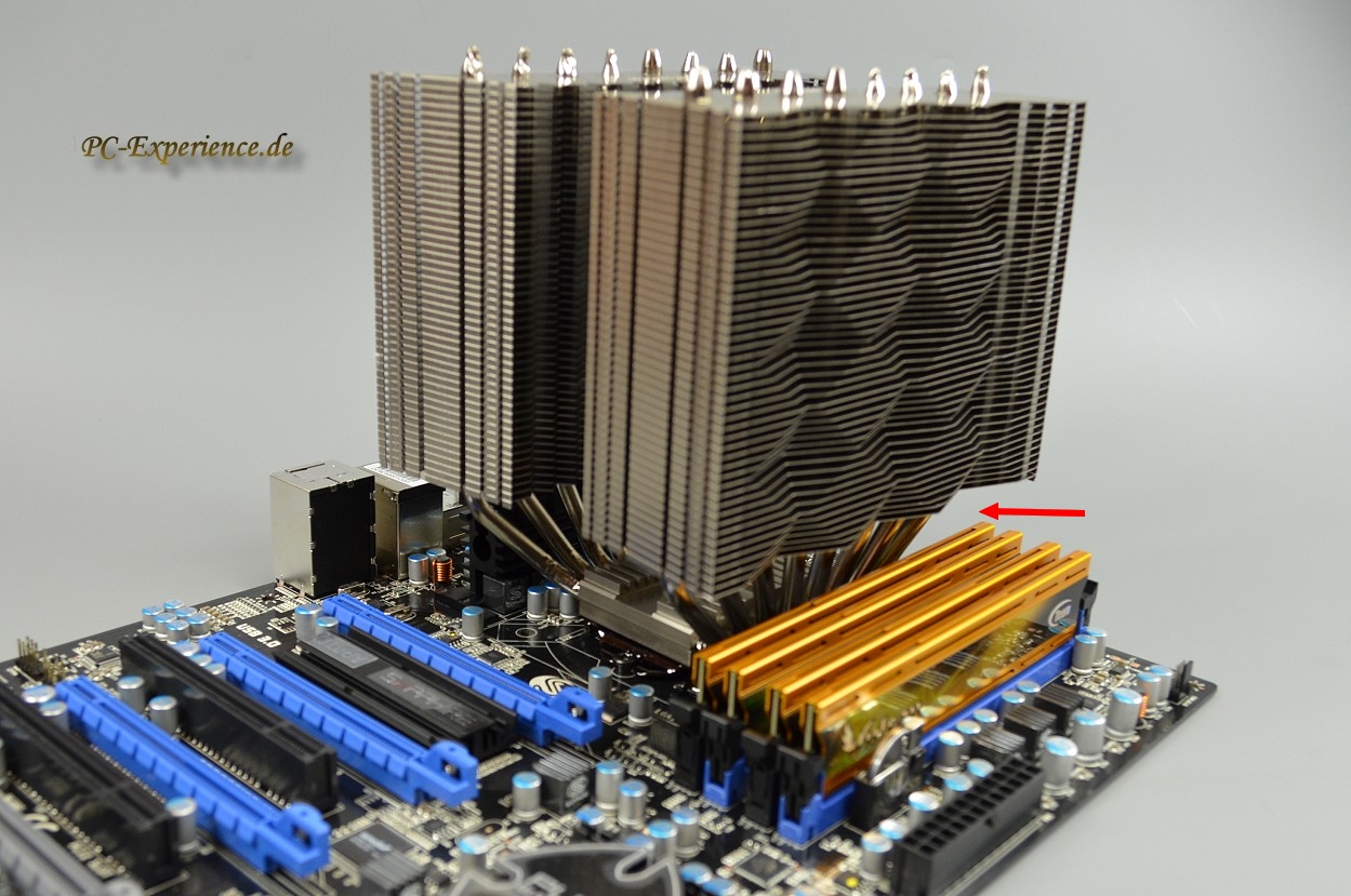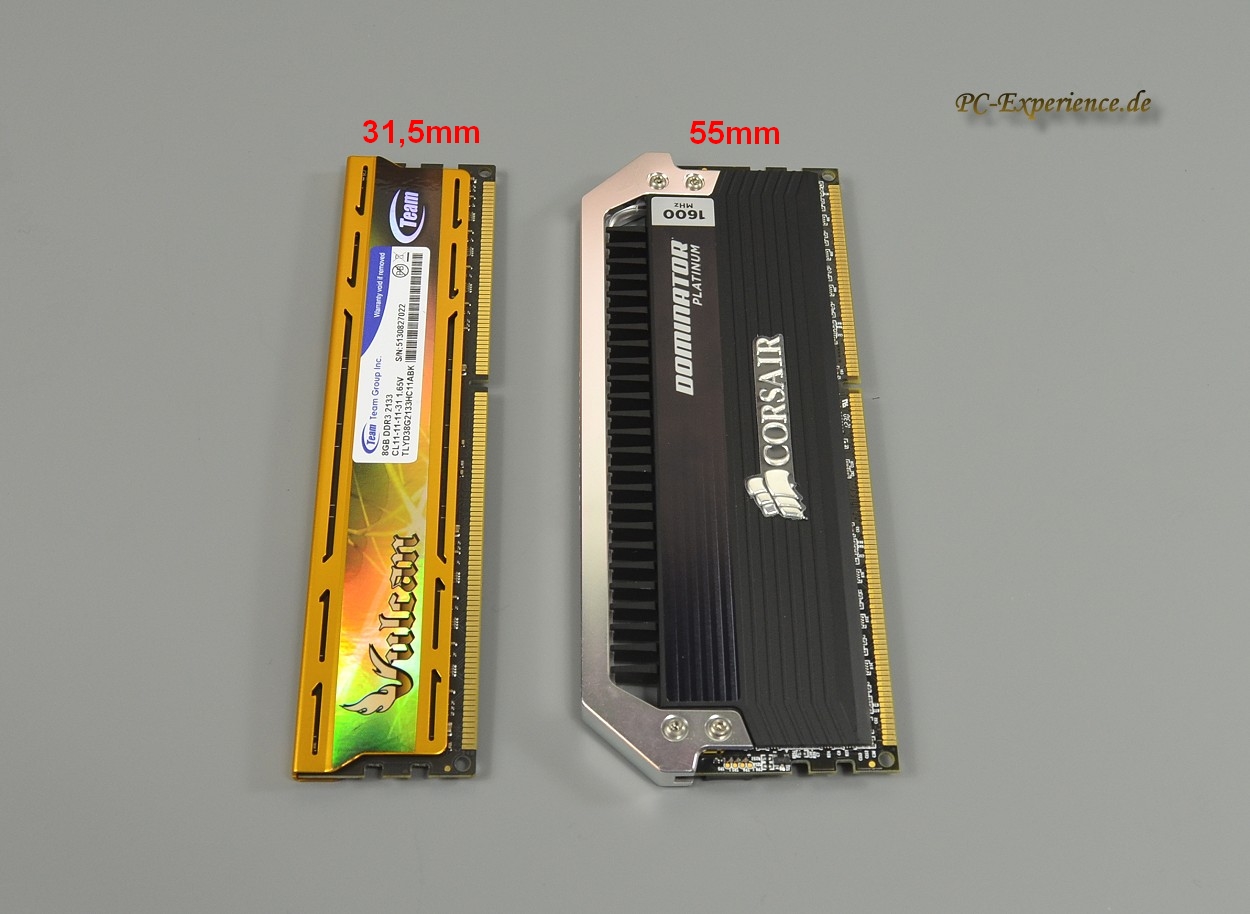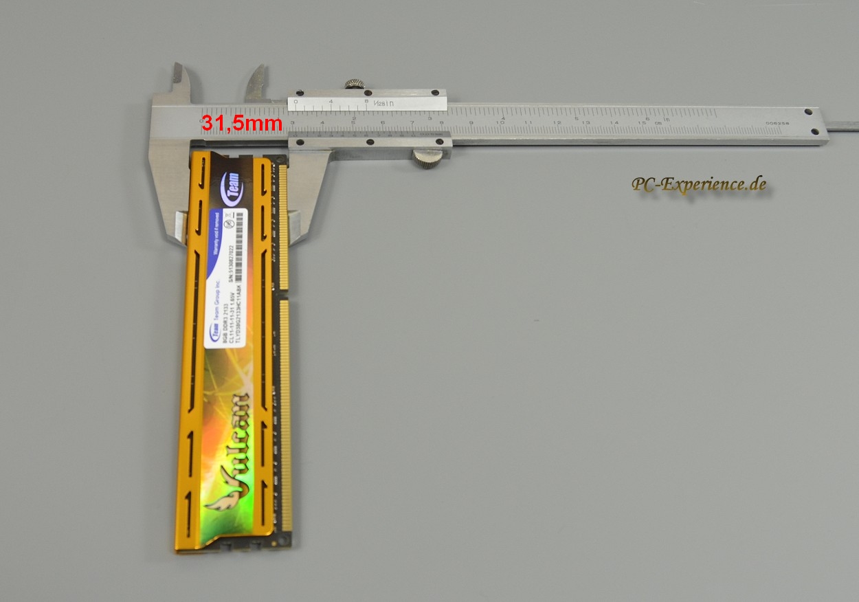 Die Heatspreader sind dezent ausgeprägt und farblich sicherlich interessant, dürften aber für eine gemeintschaftliche Corporate Identy zwischen Mainboard und Speicher kaum nützlich sein, Mainboards mit farblich passenden Mosfet Kühlern sind selten, sehen wir mal von einigen aktuellen Asus Z87 Haswell Mainboards ab, die dank der güldenen Mosfet Kühler optisch harmonieren könnten. Dafür sind die Heatspreader der Team Group Module nicht so hoch wie vermutet, 31,5mm sind bezüglich der Kompatibilität zu ausladenden CPU-Kühlern fast schon als ideal zu betrachten. Wir ihr seht, sollte man bei Prognosen trotzdem immer sehr vorsichtig agieren, unser optisches Beispiel zeigt, das Mainboards mit ungünstigen Layouts und Kühler mit gewaltigen Doppel-Radiatoren das vorherige Kompatiblitätskonzept sehr schnell ad absurdum führen können. Natürlich ist das jetzt ein Extrembeispiel, aber tut euch selbst einen Gefallen und klärt die Platzproblematik unbedingt vor dem Kauf ab, zumal diesbezüglich bei Team Group weder Hinweise noch Tipps existieren.