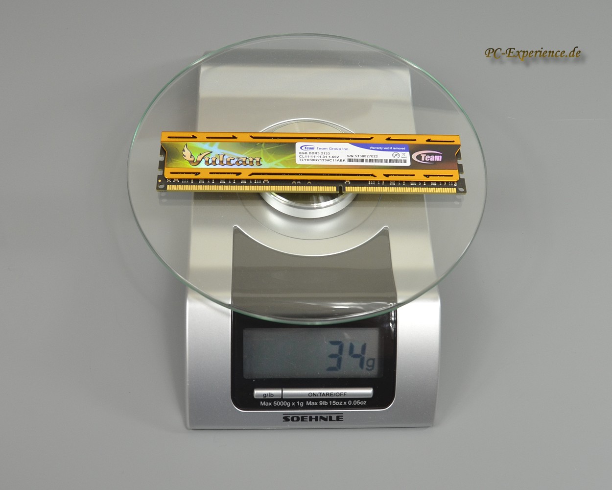 Das Gewicht der einzelnen verzüglich verarbeiteten Module bewegt sich mit jeweils 34 Gramm in einem sehr überschaubaren Bereich, im Vergleich dazu wiegt ein aktuelles Corsair Dominator Platinum Modul schon fast 90 Gramm. Das mag auf den ersten Blick keine größere Rolle spielen, aber wenn wir die 90 Gramm mit 4 multiplizieren, zerren da also bei einer Vollbestückung durchaus schon 360 Gramm an den empfindlichen Speichersockeln. Das halten die Slots von der Belastbarkeit her natürlich problemlos aus, erfordern aber auch eine sehr sorgfältige Verbringung der Module in die Slots. Also achtet bitte beim Einbau darauf, das die Module auf beiden Seiten korrekt eingerastet sind und richtig sitzen. Ansonsten hagelt es Pieptöne beim Booten und Bluescreens bis zum Sanktnimmerleinstag...!