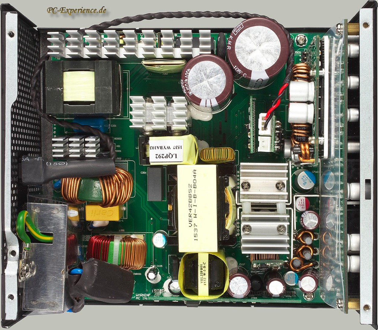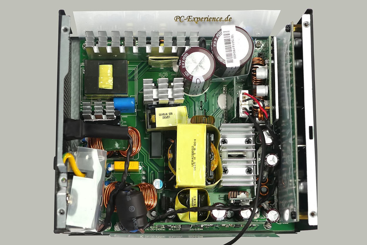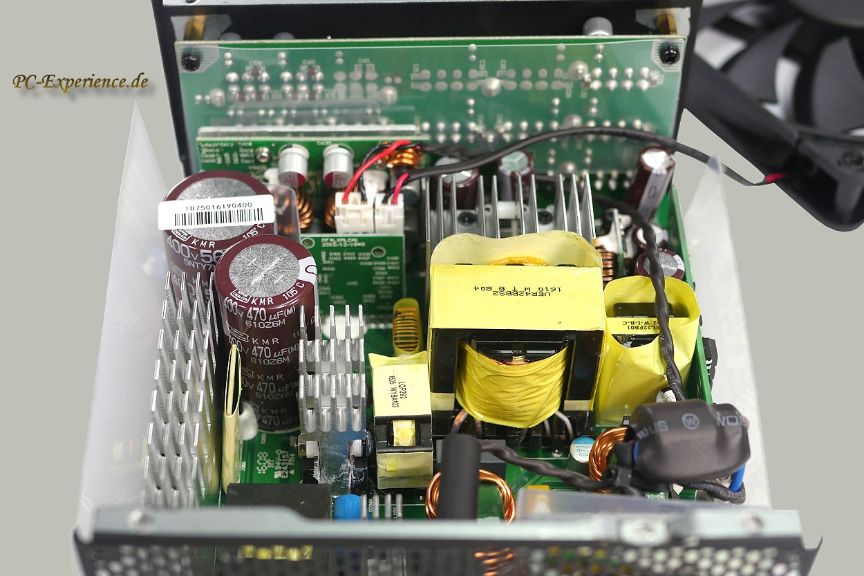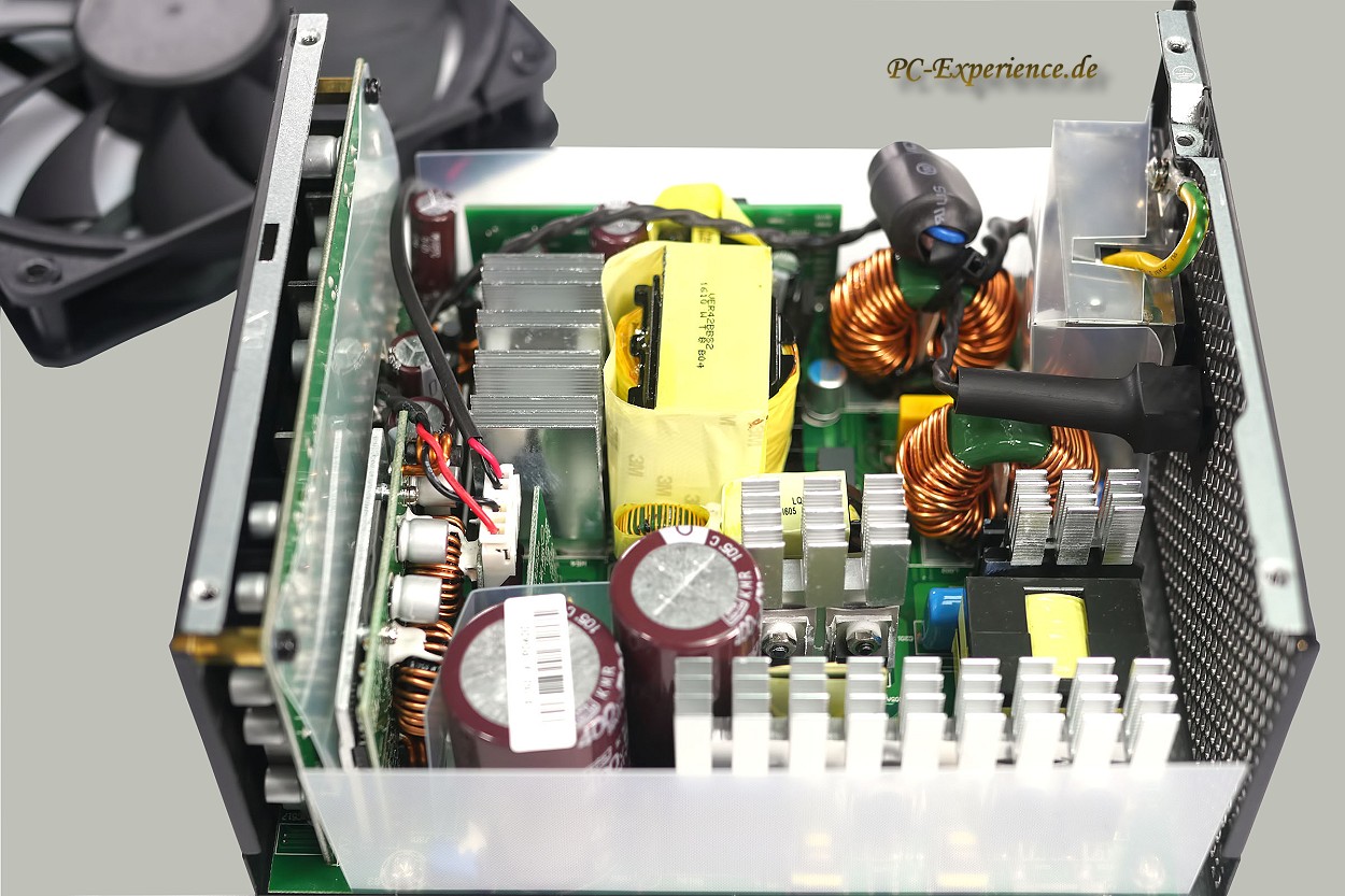 Die Eingangsfilterung (EMI) übernehmen zwei Y-Kondensatoren, ein X-Kondensator, sowie zwei Spulen und ein MOV (Metalloxid Varistor). Das ist aber beileibe noch nicht alles, es folgen weitere X-Kondensatoren und Y-Kondensatoren, Spulen, der erste Thermistor auf der Hauptplatine, die allesamt in der Nähe der beiden großen primären Kondensatoren positioniert wurden. Die im logischen Aufbau nun folgenden beiden Brückengleichrichter (Vishay LVB2560) verfügen über ausgeprägte silberne Kühlkörper, die etwas üppiger gestaltet wurden, als noch in früheren Serien. Die beiden Schaltransistoren respektive Mosfets stammen von Infineon (IPP50R140CP) und leiten ihre Abwärme ebenfalls an separate Kühlkörper ab. Als zentrale thermische Überwachung findet ein Thermistor von NTC Verwendung, der von einem Bypass-Relais unterstützt wird, das einerseits den Wirkungsgrad maximiert und andererseits dabei behilflich ist, den Thermistor bei Bedarf schneller abzukühlen.