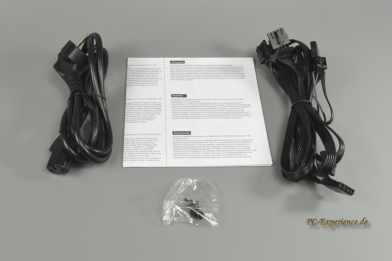 Neben dem Schutzkarton mit dem Netzteil selbst, finden wir innerhalb der Verpackung die modulen Kabelstränge, das Kaltgerätekabel, Schrauben und ein Handbuch. Wobei die Bezeichnung Handbuch kaum zutrifft, es nicht mehr als ein rudimentäres Faltblatt, ohne irgendeine verwertbare Anleitung für den Anwender. Auf der Homepage zu dem Netzteil existiert auch kein üppigeres Handbuch, dafür aber jede Menge an Marketing Material, das dem Anwender aber auch nicht dabei hilft, das Netzteil einzubauen. Scheinbar glaubt Cooler Master das daheim ausschließlich Netzteil Vollprofis sitzen. Im Grunde fehlt alles, um das Gerät sicher in Betrieb zu nehmen und so etwas können wir einer erfahrenen Firma wie Cooler Master nicht durchgehen lassen. Darüber hinaus fehlen zusätzliche Kabelbändern und/oder Klettbändern, auch wenn man die vorhandenen Kabelbänder zur Not auch im PC Gehäuse weiterverwenden könnte. Immerhin wäre der Support von Cooler Master auch deutschsprachig erreichbar, so dass im Fall der Fälle schnell weitergeholfen werden könnte.