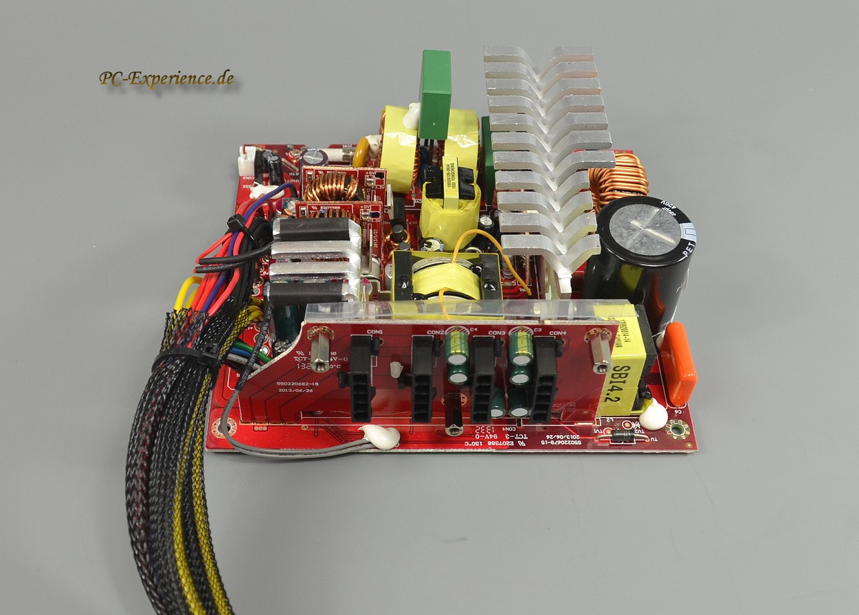 das kompakte Gehäuse erfordert ein paar kleinere Tricks, um trotzdem Hotspots zu vermeiden und die wurden von Enhance genutzt. Das LLC Resonanzwandler DC-to-DC Layout mit Dioden Bridge Rectifier (Dioden Brückengleichrichter) ist relativ leicht zu identifizieren. Die vier Leistungstransistoren (Mosfets, Infineon IPP041N04N) zur Erzeugung der 12Volt Schiene(n) sitzen fast zentral im Netzteil, gut zu erkennen an dem markanten 4-Rippen Kühlkörper, unter dem auch noch ein Thermistor seinen Dienst verrichtet, der mit der Lüftersteuerung kommuniziert (OTP Überhitzungsschutz).