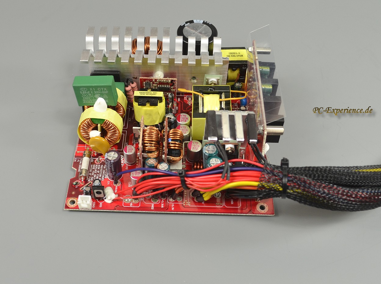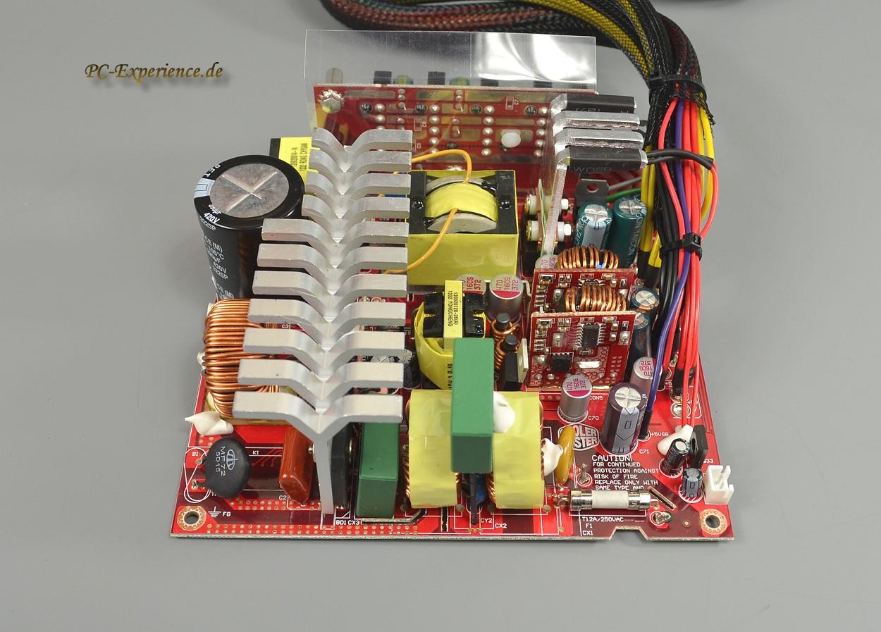 Aber der Reihe nach: Die Eingangsfilterung (EMI) übernehmen zwei Y-Kondensatoren, ein X-Kondensator, sowie zwei Spulen und ein MOV (Metalloxid Varistor). Das ist aber beileibe noch nicht alles, es folgen weitere X-Kondensatoren und X-Kondensatoren und Spulen, die in der Nähe des großen primären Kondensator positioniert wurden. Die im logischen Aufbau nun folgenden Brückengleichrichter verfügen über ausgeprägte silberne Kühlkörper, die etwas üppiger gestaltet wurden. Unterstützt werden die Gleichrichter von einer ST Microelectronics Leistungsdiode. Die beiden Schaltransistoren respektive Mosfets stammen von Infineon (IPP50R280CE) und leiten ihre Abwärme ebenfalls an separate Kühlkörper ab. Um den primären Bereich abzuschließen, darf der große primäre Elko nicht fehlen, es handelt sich um einen japanischen Elko aus dem Hause Matsushita/Panasonic in der Güteklasse HC, der mit einer Spannungsfestigkeit von jeweils 420 Volt aufwartet, über eine Kapazität von jeweils 390mikroFarad verfügt und bis 105°C als maximale Belastungstemperatur ausgelegt ist.