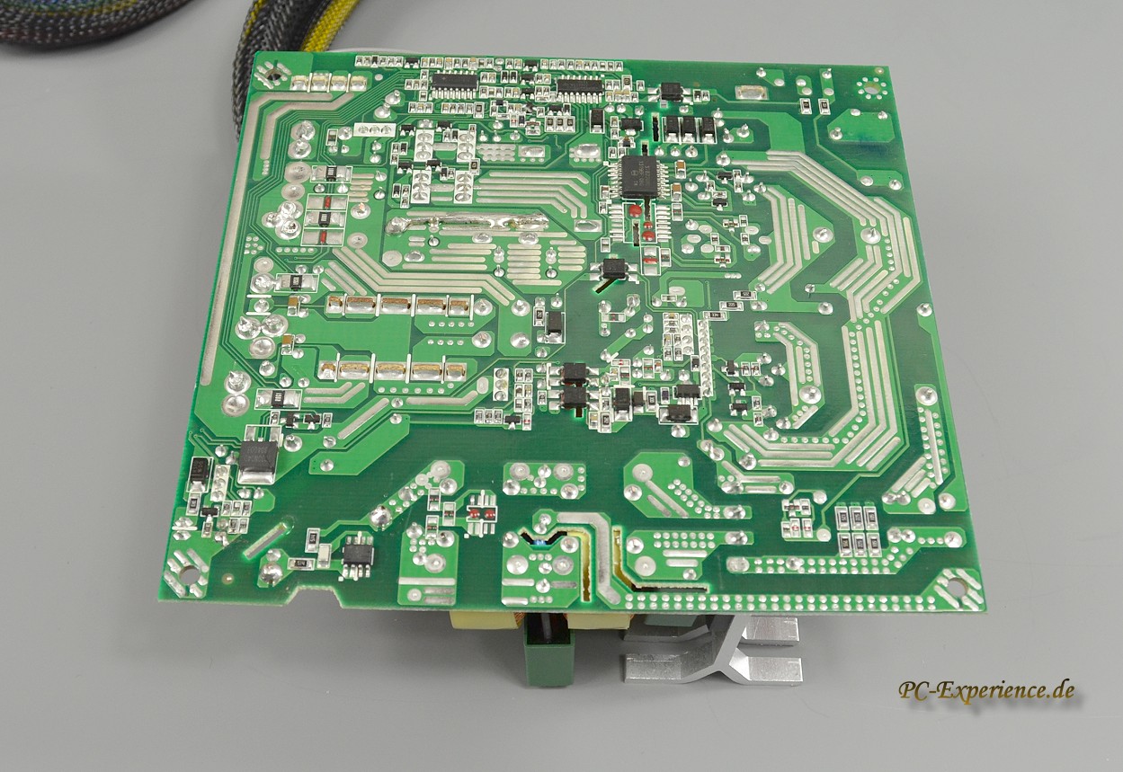 Die winzigen VRM Platinen zur Aufnahme der DC-to-DC Elemente und Generierung für 3,3 bzw. 5 Volt sitzen gut erkennbar ebenfalls im sekundären Netzteil Bereich. Gesteuert wird das Ganze über jeweils einen APW7073 PWM Controller. Der LLC-Resonanzwandler stammt von Champion Micro (CM6901) und sitzt auf der Rückseite der Hauptplatine. Für den Standby-Betrieb ist ein PWM Controller von Sanken mit integriertem Transistor zuständig (STR-A6000H Series), für die 5VSB Schiene zeichnet ein Transformator-Gleichrichter von PFC-Device verantwortlich. Die Schutzschaltungen des Netzteils werden von einem alten Bekannten überwacht, einem PS 223 Controller von Silicon Image, der sich ebenfalls auf der Rückseite der Hauptplatine befindet. Was uns Cooler Master mit dem Begriff 3D Leiterplattendesign sagen will, leuchtete uns nicht wirklich ein, zumal es bei diesem kompakten Platzangebot kaum eine Alternative zur direkten Verlötung von platzbeanspruchenden Zusatzplatinen mit der Hauptplatine gibt. Sehr deutlich wird dies auf der Tochterplatine für das Kabelmanagement, wo wir darüber hinaus etwas hochwertigere Elkos als die dort verlöteten Elkos von Suncon erwartet hätten. An diesem schlecht zu kühlendem Bereich werden normalerweise hitzebeständigere Feststoff-Kondensatoren eingesetzt.