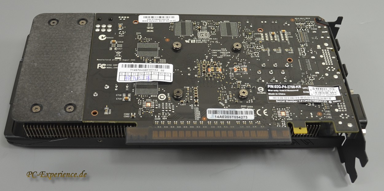 Der Port für den 6-poligen Stromanschluss sitzt oben auf der EVGA, ist sehr gut zugänglich und verlängert die Grafikkarte nicht noch zusätzlich. Das alles paßt perfekt zur Optik der Grafikkarte, die einen äußerst harmonischen und sehr gut verarbeiteten Eindruck hinterläßt. Die schicke schwarze Platine selbst besteht aus einem 6-Layer Platinendesign, nichts herausragendes, aber eben auch keine Tupperware, zumal sie in FR4 gefertigt wurde, also kein billiges Pertinax sondern schwer entflammbar mit einer guten Signalqualität.