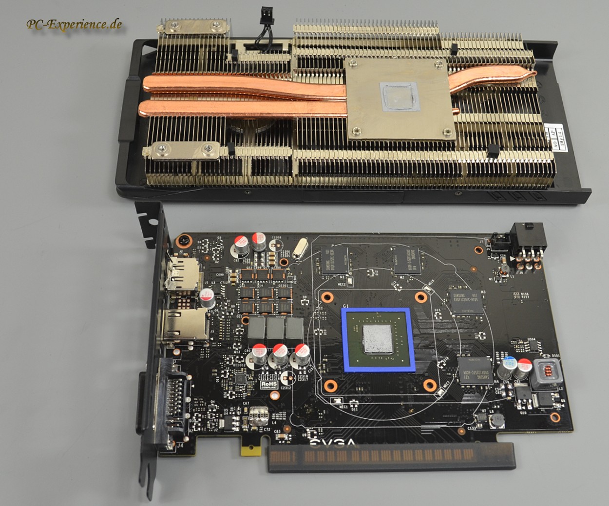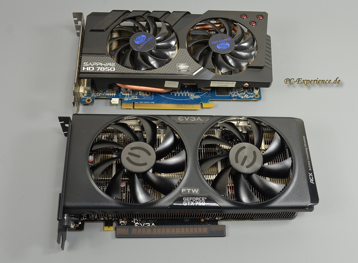 Im Größenvergleich zu einer Sapphire Radeon HD 7850 OC fallen gleich zwei Aspekte ins Auge, die deutlich längere Platine (229mm) und der relativ voluminöse Kühler, der im direkten Vergleich nicht nur mehr Kühllammelen bietet, sondern auch aufwendigere Heatpipes. Mit dieser 2,5-slot Kühllösung und den Abmessungen fällt die EVGA eigentlich aus dem Raster für kleine HTPCs, aber es existieren ja durchaus auch größere Gehäuse und eben auch Mini-ITX Gehäuse, wo so eine Grafikkarte Unterschlupf finden könnte.
