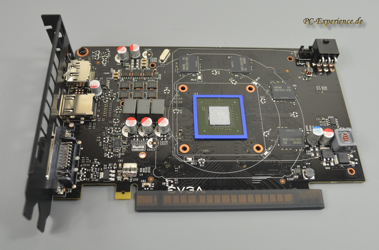 Das Layout der EVGA bringt nicht viele Überraschungen zu Tage, neben einigen Polymer-Aluminium-Kondensatoren und den Speicherchips von Samsung finden wir drei geschlossene und eine unverschlossene Spule für die Spannungsversorgung der GPU respektive des Speichers. Warum die Speicherspuele nicht geschlossen wurde, entzieht sich unserer Kenntnis. Aber sie wurde immerhin mit Expoxidharz vergossen, so dass sich die Neigung zum Fiepen in Grenzen halten sollte, was sich übrigens in unserem Test bestätigte. Ansonsten gäbe es nichts besonderes zu berichten, so eine 120 € Grafikkarte hat im Vergleich zu einem 500 € Derivat natürlich nicht den Aufwand dieser High-End Pixellieferanten zu bieten.