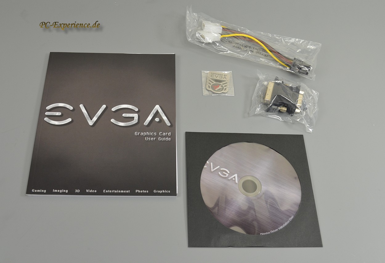 Es mag sehr subjektiv klingen, aber bei EVGA hat man immer ein wenig das Gefühl, etwas besonderes auszupacken. Das mag sicherlich auch daran liegen, dass die Verpackung sehr dezent und wenig marketingträchtig designt wurde und dass Grafikkarten von EVGA sehr viel Haptik ausstrahlen. Viel enthalten ist leider trotzdem nicht, neben der Grafikkarte fallen lediglich die obligatorische Kurzanleitung, eine Treiber-und Utilities CD, sowie 1x DVI-to-VGA Adapter und 1x 6-pin PCIe Adapter aus dem Karton. Das kleine Case Badge macht dann auch nicht mehr viel wett, es ist zwar alles wichtige vorhanden, aber eben kein Spiel oder einfach mal etwas überraschendes.