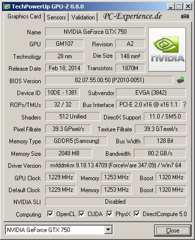 Die technischen Daten der EVGA GeForce GTX 750 FTW ACX Cooler: