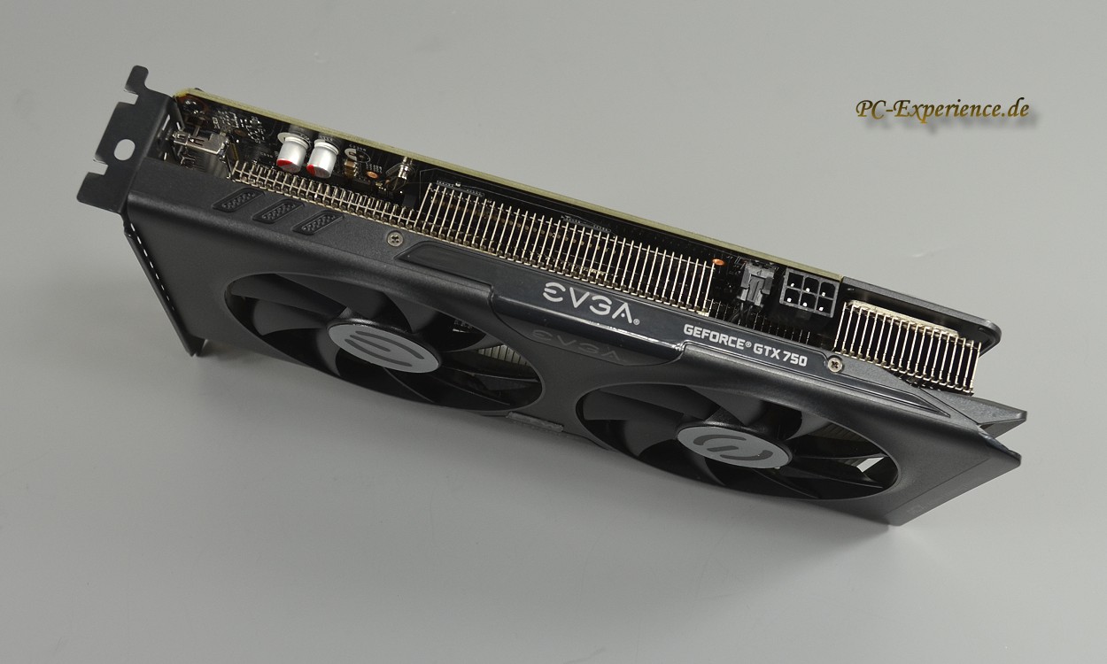 Der 6-polige Stromanschluss liegt wie erwähnt gut zugänglich oben auf der Grafikkarte, somit verlängert der Port die Karte nicht noch zusätzlich und erleichtern auf diese Weise den Anschluß. Der Port ist auch notwendig, denn über den PCIe Slot wären maximal 75 Watt abgreifbar, das reicht für die Stromversorgung ohne Last sicherlich aus (7,3 Watt idle), aber eben nicht unter Last, wo die EVGA bis zu 146 Watt benötigt.