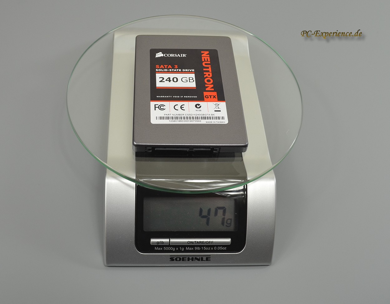 Unsere Waage präsentiert keine Überraschungen, die Corsair Neutron GTX wiegt exakt 47 Gramm. Damit liegt die Neutron GTX im Bereich aktueller SSDs, eine OCZ Vertex 4 wiegt beispielsweise 91 Gramm, die Samsung 830 59 Gramm, Crucials m4 73 Gramm und die Intel 510 knappe 80 Gramm. Ein Einbaurahmen wird also keinesfalls vor unüberbrückbare Herausforderungen gestellt, große 3,5" Festplatten ab 1TB aufwärts wiegen dank ihrer aufwendigen Mechanik nicht selten bis zu 700 Gramm und darüber hinaus.