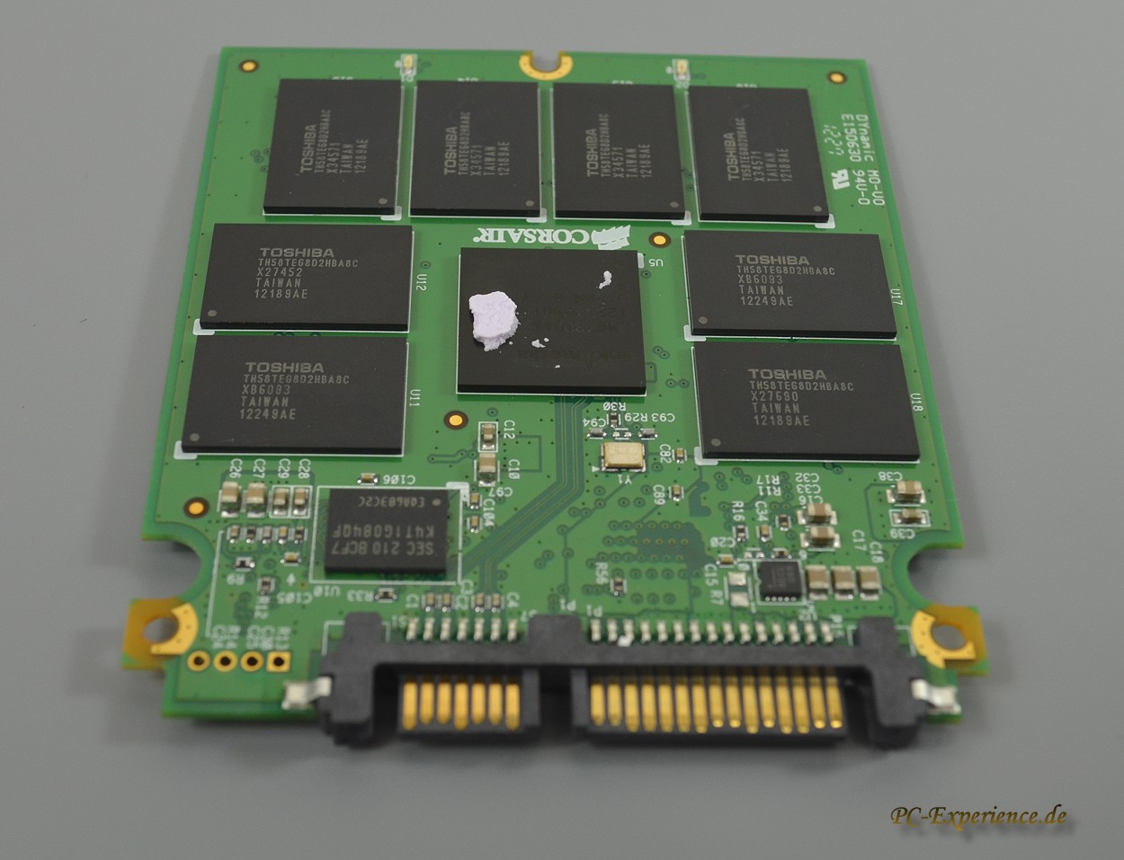 Die Lötqualität der feuerfesten FR4-Platine charakterisieren wir als ausgezeichnet, auf der Vorderseite der Platine wurden insgesamt 8 Stück Toshiba MLC Toggle NAND Flashspeichermodule a 32GB verlötet, das ergäbe nominell eine Kapazität von 256GB. Da Link A Media aber 12,7% der Kapazität als Spare Area deklariert und somit für Wear Leveling, Garbage Collection und den Austausch defekter Datenblöcke reserviert, bleiben für den Kunden netto 240GB übrig. Nun stellt sich möglicherweise die Frage: worin unterscheidet sich die Corsair Neutron GTX von der Neutron ohne GTX außer dem andersfarbigen Aufkleber? die Frage lässt sich recht klar beantworten: die Neutron GTX verwendet synchron angesteuerte MLC Toggle NAND Flashspeichermodule, die normale Neutron eben nicht, dort kommen asynchron angesteuerte MLC ONFI NAND Flashspeichermodule von Micron zum Einsatz. Die Trim Funktion wird natürlich von allen Neutron SSDs unterstützt und für alle die sich mit dem Begriff noch etwas schwer tun, eine kleine Erklärung der Funktionsweise: ein Betriebssystem, das den Trim ATA-Befehl umsetzen kann, also Windows 7 aufwärts, meldet dem SSD Controller, dass bestimmte gelöschte Datenstrukturen frei geworden sind. Dies nimmt der SSD Controller zur Kenntnis und markiert diese Datenblöcke als ungültig. Dadurch werden diese Blöcke quasi vom permanent protokollierten Merkzettel der SSD gestrichen und in den Ruhephasen des Laufwerks gelöscht. Dies wiederum hat zur Folge, dass diese jetzt frei gewordenen Datenblöcke sozusagen frisch renoviert wieder vom System möglichst ohne Performanceverlust verwendet werden können.