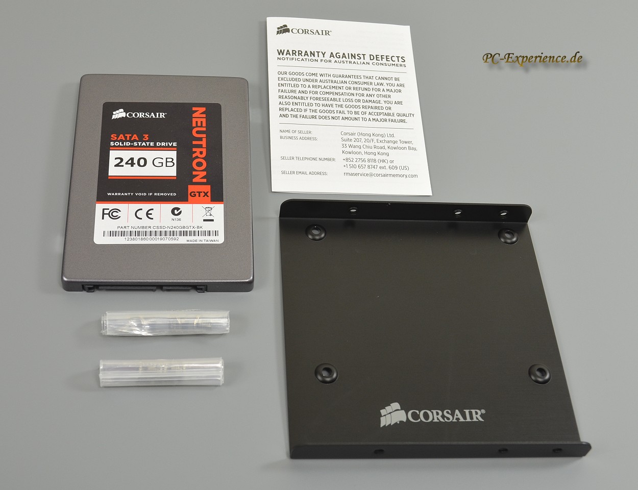 Die kleine Corsair Schachtel enthält leider weniger als erhofft, außer einem Einbaurahmen, den notwendigen Schrauben und einer winzigen Doku befindet sich nichts weiter in der Verpackung. Keine Anleitung und auch keinerlei Software, geschweige denn geeignete Stromadapter und/oder Datenkabel, das kann die Konkurrenz teilweise deutlich besser. Dies ist in doppelter Hinsicht ärgerlich, denn Corsair lässt den Anwender mit der Installation der SSD weitestgehend allein und nicht jeder wacht morgens auf und weiß alles über SSDs. Dazu addiert sich der Umstand, dass immer noch genügend Interessenten existieren, die so eine SSD auch unter Windows XP oder Windows Vista nutzen wollen und die unterstützen bekanntlich keine Trim Funktion, so dass trotz Garbage Collection gelegentlich manuell etwas nachgeholfen werden muss. Intel und Samsung sind diesbezüglich mit ihren ausgezeichneten SSD-Verwaltungs-Tools mindestens einen Schritt voraus. Wer mehr über seine künftige SSD erfahren will, muss sich durch die Corsair Homepage hangeln, die leider auch keine weiterführenden Artikel bereit hält und teilweise auch falsche Daten zur Neutron GTX anzeigt.