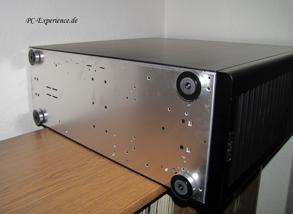 Der sichere, rutschfeste und geringfügig entkoppelte Stand des Gehäuses wird durch Moosgummi-Standfüße bewerkstelligt, eine sehr probate und attraktive Lösung, wie sie auch für HIFI-Anlagen Verwendung findet, wenn auch dort noch etwas aufwendiger ausgeführt, zumindest bei den teureren Geräten. Kleiner Tipp: die beliebten silbernen Aluminium-Laufrollen