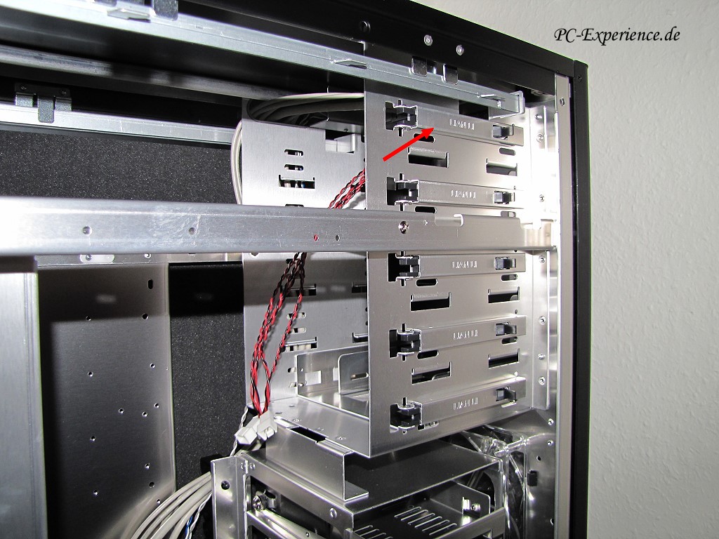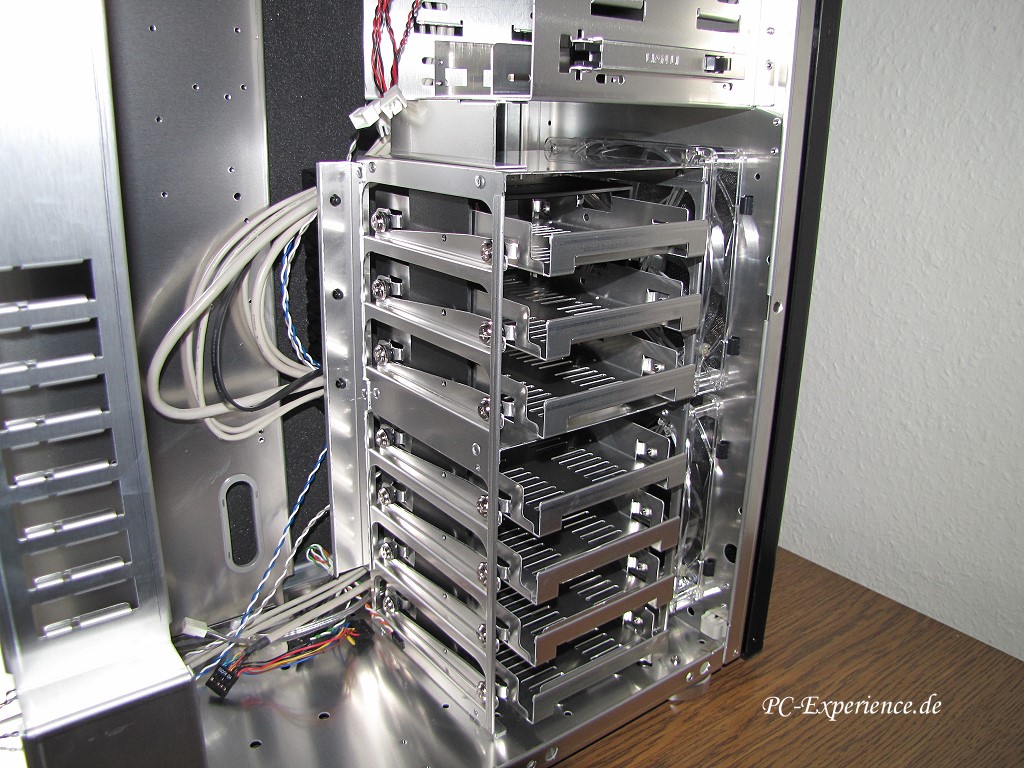 Der Festplattenkäfig für die möglichen vorderen sieben Festplatten ist natürlich auch mobil sprich herausschraubbar und verfügt wie üblich über die beliebten Gummientkoppelungen, mit denen sich zumindest ansatzweise laute Festplatten zu einer vertretbaren Arbeitslautstärke überreden lassen. Direkt dahinter sehen wir schon die vorkonfigurierten Aufnahmen der Gehäuseverkabelung, die teilweise dort fixiert wurde. Wenn wir das andere Seitenteil ebenfalls entfernen, sehen wir gleich noch etwas detaillierter, was dies für unser angestrebtes Kabelmanagement bedeutet.