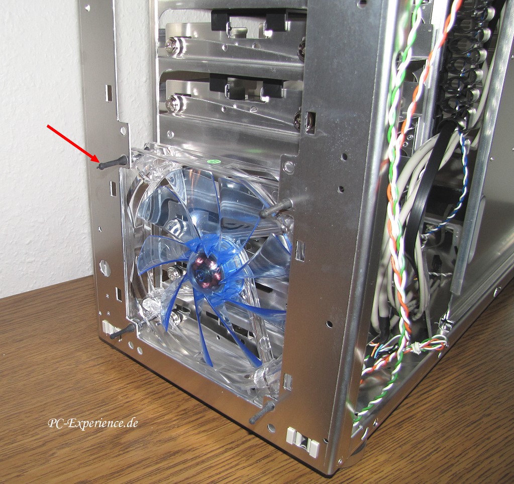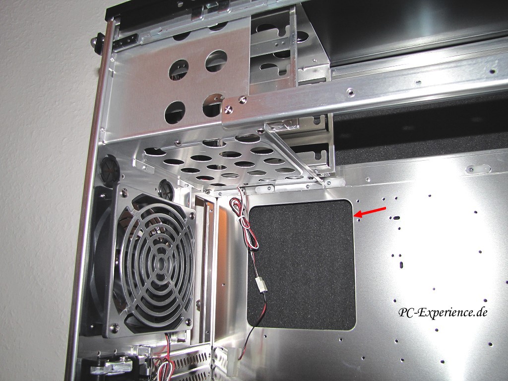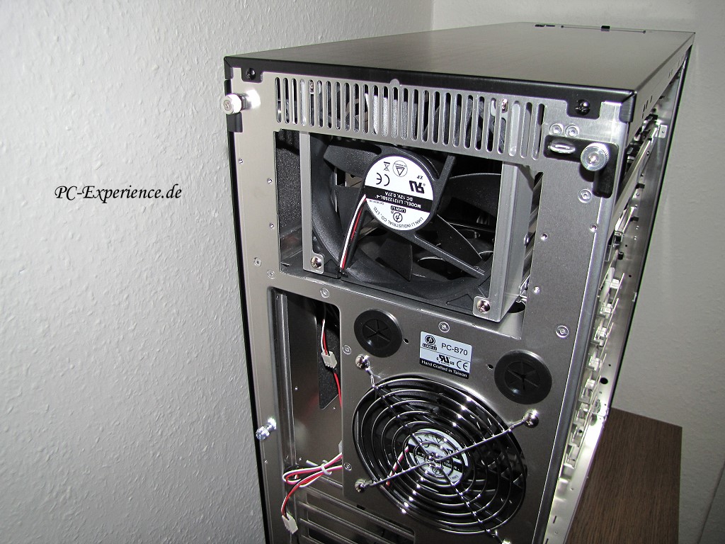 Die große zentrale Öffnung der Mainboard-Aufnahme erleichtert den EIN-und Ausbau des CPU-Kühlers, so daß gegebenenfalls das Mainboard nicht entfernt werden muß. Der hintere zentrale 120mm Lüfter sitzt hinten im Einzugsbereich des Mainboards/Grafikkarte/CPU, also genau an der richtigen Stelle. Auf Grund der schnörkellosen Befestigung, wäre es kein Problem, den Lüfter mit entsprechenden Gummistiften zu entkoppeln. Aber was für ihn gilt, gilt auch für den vorderen Lüfter, Lüfterentkoppelungen sind leider Fehlanzeige.