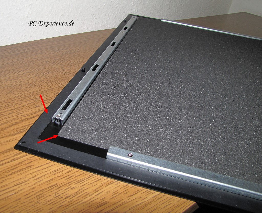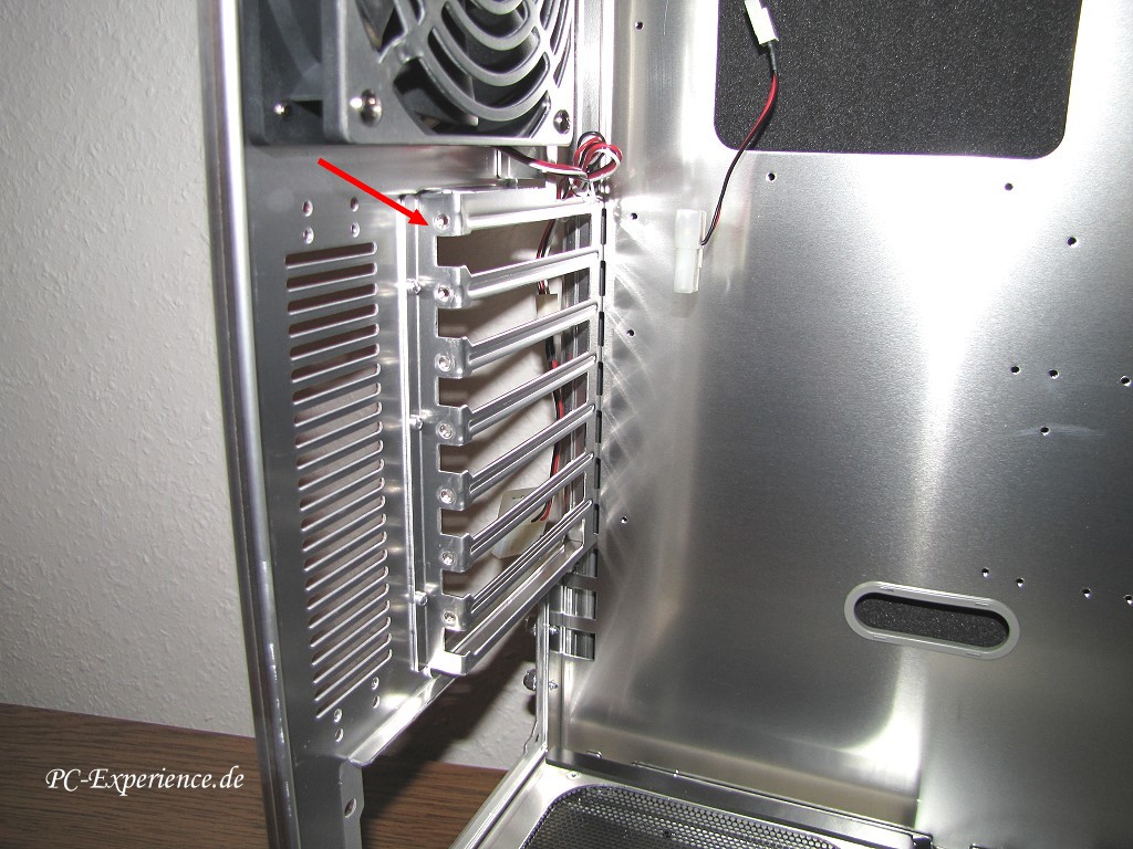 Die große breite vertikale Verbindungsstrebe sorgt für zusätzliche Verwindungssteifigkeit und Stabilisierung langer Steckkarten, dank zweier Schrauben läßt sich sich aber gut entfernen, was den Zugang zum Gehäuseinneren deutlich erleichtert.