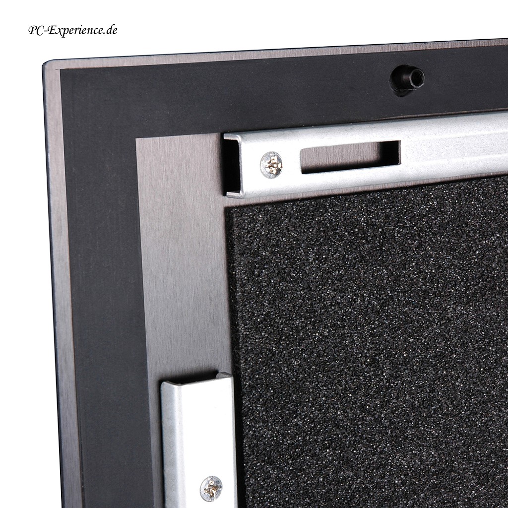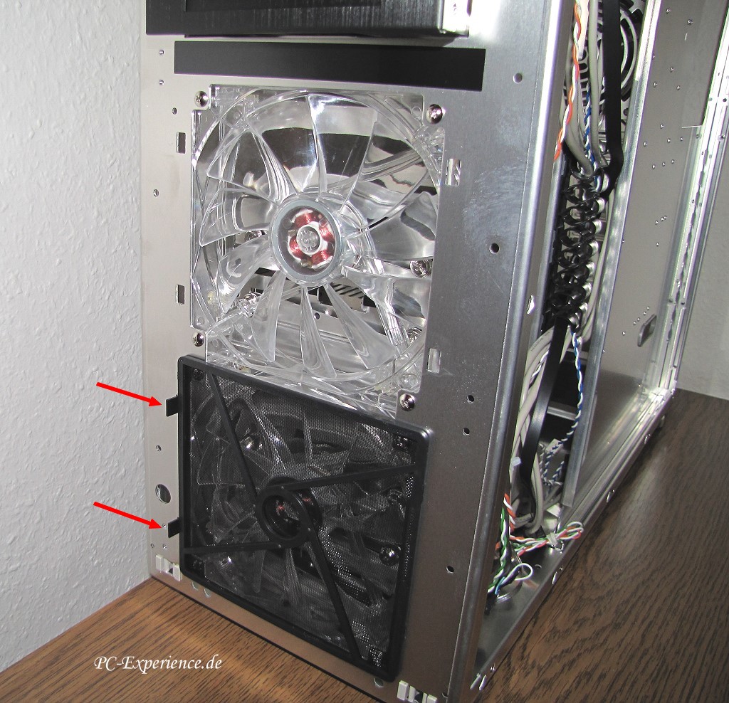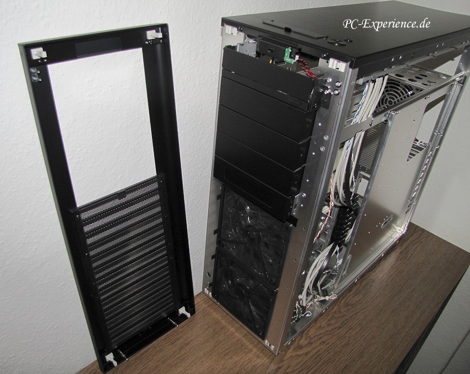 Die sehr stabile und dickwandige Aluminium Frontverkleidung läßt sich sehr leicht mit einem minimalen Ruck entfernen, wobei die Verschlußclips sehr widerstandsfähig ausgelegt wurden, so daß man nicht so bald mit ihrem vorzeitigen Ableben rechnen muß. Die Staubfilter der Frontlüfter sind schnell und bequem auszuklippen und somit komfortabel unter dem Wasserhahn zu reinigen oder eben ausblasbar. Hinter den Blenden befinden sich glücklicherweise keine weiteren Blenden, die womöglich auch noch herausgebrochen werden müssen. So kann das Gehäuse immer wieder in den Auslieferungszustand zurückversetzt werden. Die Blenden als solche weisen eine hohe Passgenauigkeit auf und lassen sich überwiegend kratzerfrei klemmen. Das die Blenden nicht auch noch über Mesh Blenden verfügen, war eine weise Entscheidung, durch den sich der Staubbefall weiter reduziert hat.
