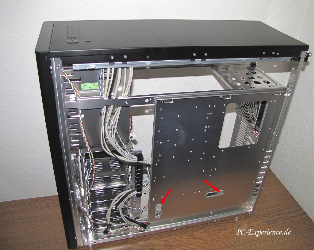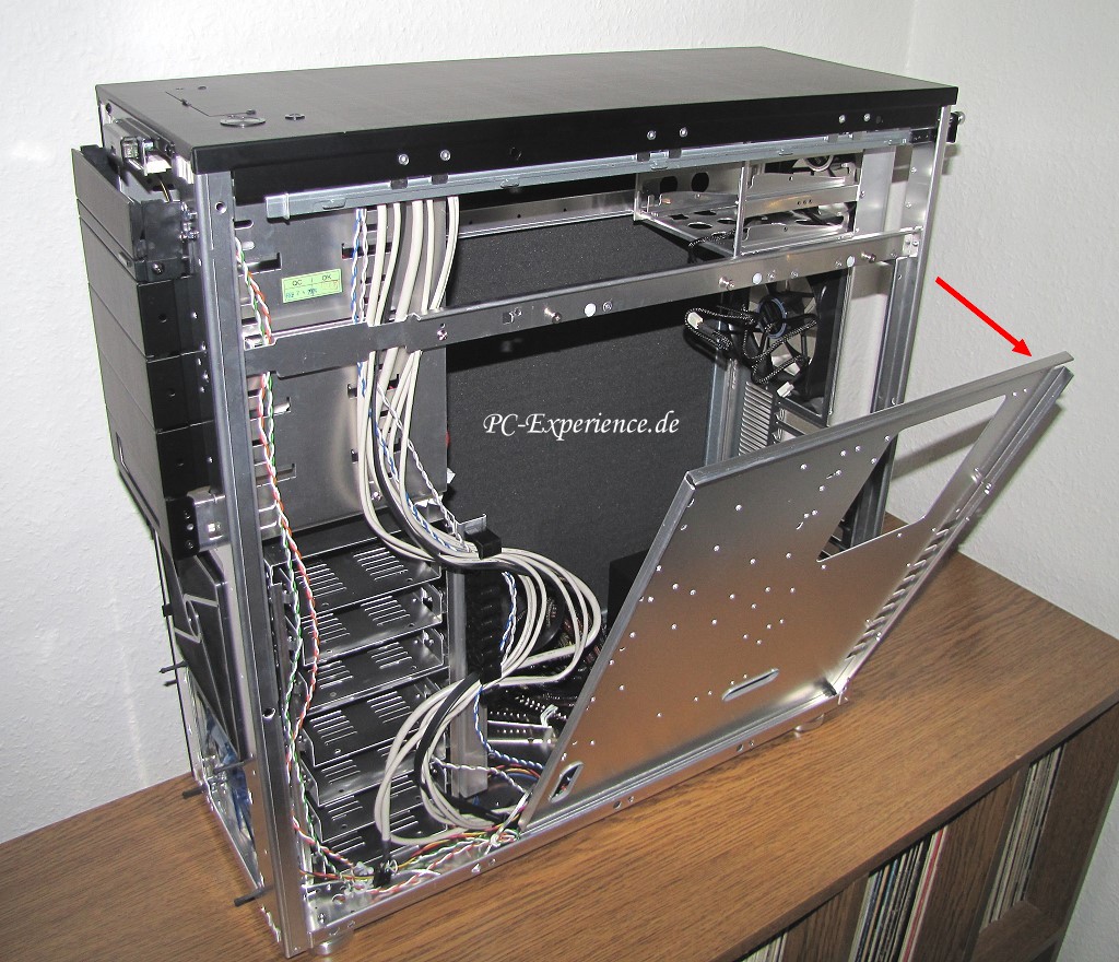 Nach der Entfernung des linken Seitenteils erkennen wir jetzt sehr deutlich die manigfaltigen Möglichkeiten zur sauberen Kabelverlegung im Gehäuse. Die seitlichen Halterungen unterstützen dies ebenso, wie die Öffnungen im Mainboardschlitten, der über wenige Schrauben sehr schnell aus seiner Verankerung befreit werden kann. Diesbezüglich sollten eigentlich kaum Wünsche offen bleiben.