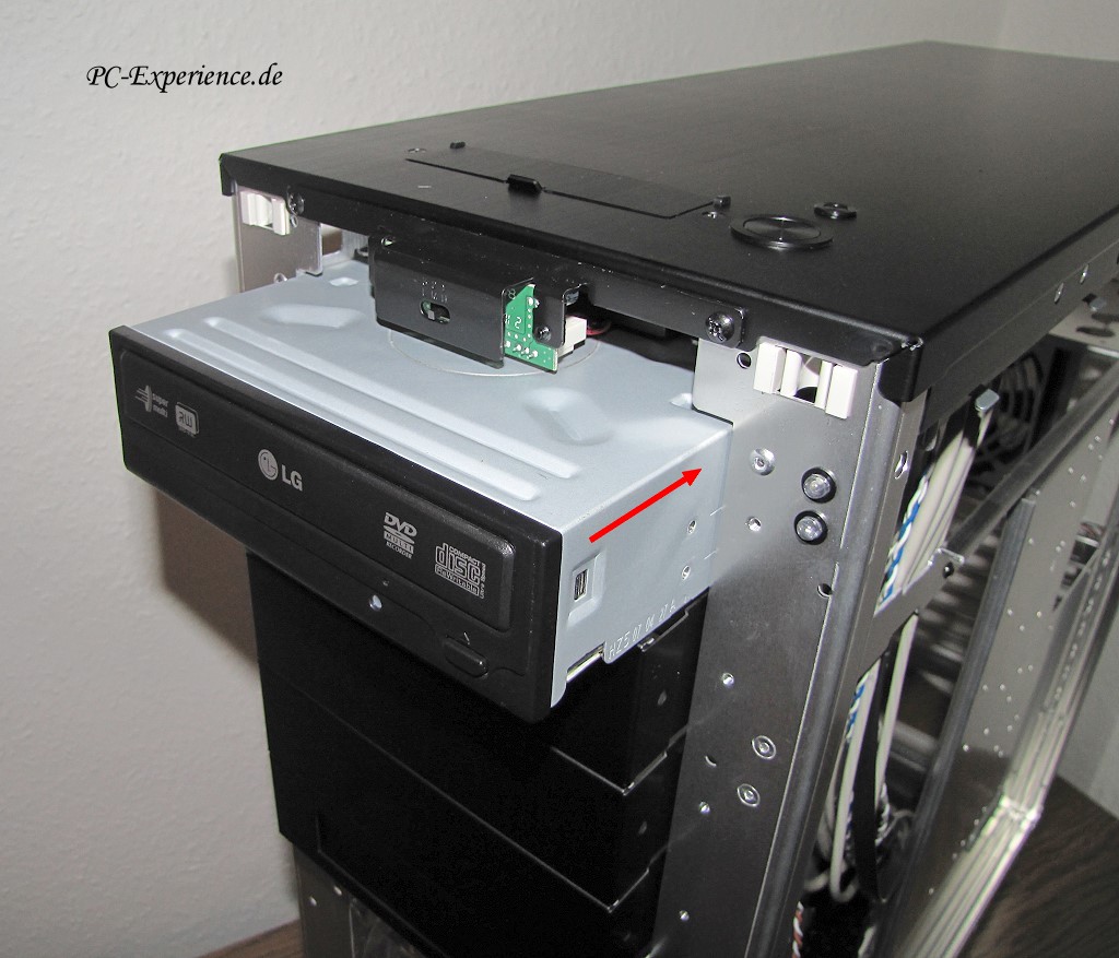 Die Integration der optischen Laufwerke kann wie bereits erwähnt entweder über die seitlich Entkoppelungshebel erfolgen, oder über die traditionelle Verschraubung, beide Optionen sind gleichermaßen praktikabel. Lian Li hat noch eine Versteckoption mitgeliefert, über die sich ein optische Laufwerk sehr dezent verbauen läßt, da die Frontansicht verborgen bleibt. Bei leichtem Druck auf den Auswurfknopf der Frontklappe öffnet sich so die Lade des Laufwerks. In der Praxis verhält sich diese Vorrichtung völlig unproblematisch, was man von früheren ähnlichen Konstruktionen nicht behaupten konnte.