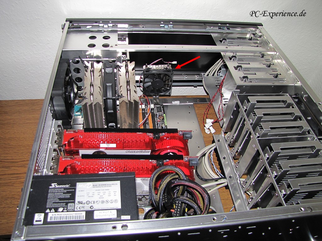2. man könnte das Netzteil auch ganz nach oben in seine oft angestammte typische Position verbringen, nur entfällt dann ein 120mm Lüfter nebst Festplattenkäfig und das ist nun wirklich nicht einzusehen. Außerdem ergaben sich in unserem Testaufbau keinerlei thermische Vorteile durch diese Positionierung.