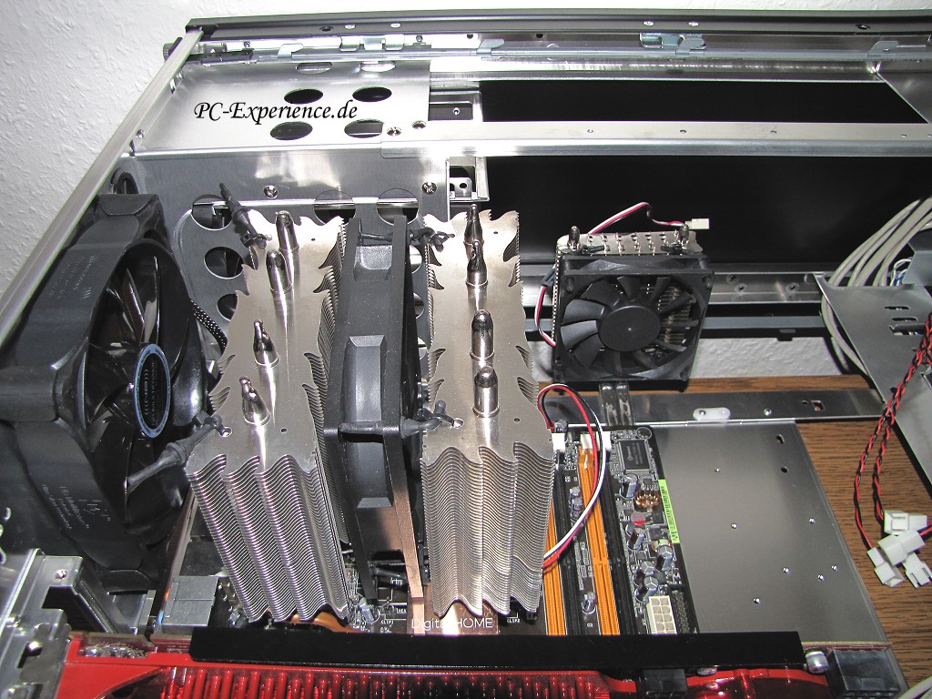 Platz ist im Überfluss vorhanden, so daß auch Grafikkarten mit einer Platinenlänge über 27cm anstandslos zu verbauen sind. Das gilt auch für ausladende Towerkühler wie z.B den IFX-14 von Thermalright, wie wir an den nächsten Bildern erkennen werden.