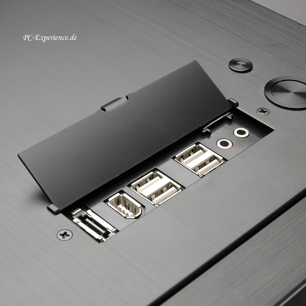 Wie bei allen neuen und aktuellen Lian Li Gehäusen wurde das IO-Panel von Grund auf neu gestaltet und benutzerfreundlicher plaziert, nämlich vorne auf dem Deckel. Man erreicht alle Knöpfe und Anschluß-Ports ohne Verrenkungen, egal wo das Gehäuse aufgestellt wird. Die Ein-Ausschaltknöpfe sind natürlich ebenso aus Aluminium, wie der Reset Knopf und der Verschlußdeckel für USB, eSATA und Konsorten. Die USB Ports haben genügend Abstand zueinander, so daß auch ausladende USB-Sticks nebeneinander ihren Platz finden. Die staubanfälligen Ports wurden unter einer mit einem satten Plopp schließenden Klappe geschützt angeordnet, das hat nicht nur Stil, sondern erweist sich in der Praxis auch als äußerst sinnvoll. Die Funktions-LEDs finden wir oben rechts an der Frontverkleidung, wo einerseits der Betrieb des Systems (blaue LED) und andererseits die Festplattenzugriffe optisch dargestellt werden (rote LED).