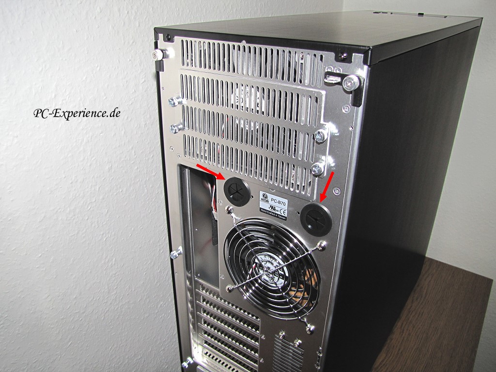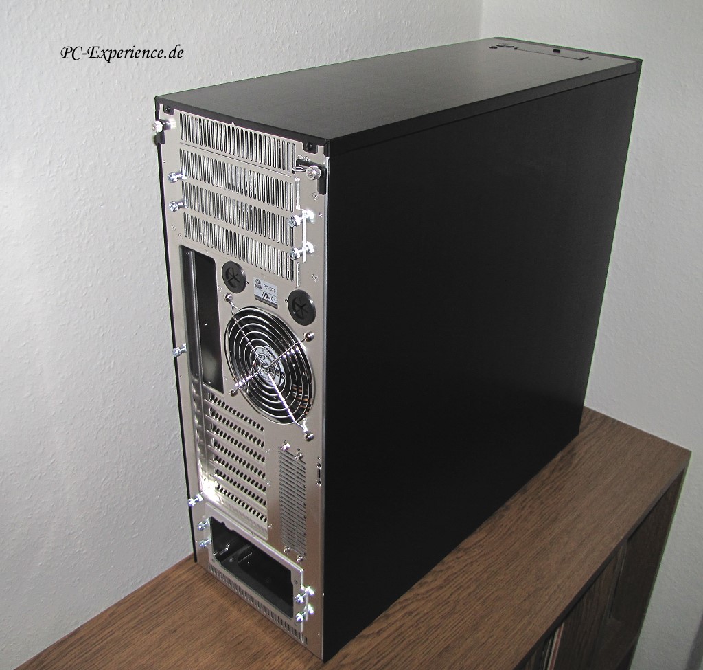 Die Verarbeitung der Heckpartie ist genauso eine Augenweide, wie der Rest des Gehäuses, da existiert keine Ecke, die nicht akribisch bearbeitet wurde. Das Gitter des mittleren 120mm Heck-Lüfters läßt sich entfernen, das erspart Verwirbelungsgeräusche. Deutlich erkennbar sind die beiden Schlauchdurchführungen für die optionale Wasserkühlung, ein weiteres Feature, das mittlerweile bei kaum einem neuen Lian Li Gehäuse fehlt. Das rechte Seitenteil könnte durch eine vorhandene Öse neben der Thumbscrew-Verschraubung mit einem kleinen Schloß gesichert werden.