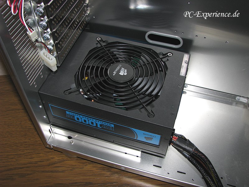Nun kann man einerseits das Netzteil in seiner "normalen" Position mit dem Lüfter nach unten einbauen. Dann kümmert sich das Netzteil im Grund nur um sich selbst und seine Kühlung. Anderseits ist es dank der variablen Blende aber auch möglich, das Netzteil mit dem Lüfter gen Innenraum zu verbauen, was wir bevorzugen, denn das Netzteil darf sich gerne am Abtransport der Abwärme aus dem Gehäuse beteiligen, zumal es dann immer noch genug für seine Eigenkühlung tut. Da das Netzteil gen Innenraum nicht hermetisch abisoliert ist, gelangt ohnhin Abwärme aus dem Innenraum ins Netzteil, egal welche Einbaurichtung bevorzugt wird. Ein weiterer Vorteil dieser Einbauvariante wäre die etwas reduzierte Staubaufnahme, da unser Netzteil dann in Bodennähe nicht zum Flusensuchgerät mutiert.