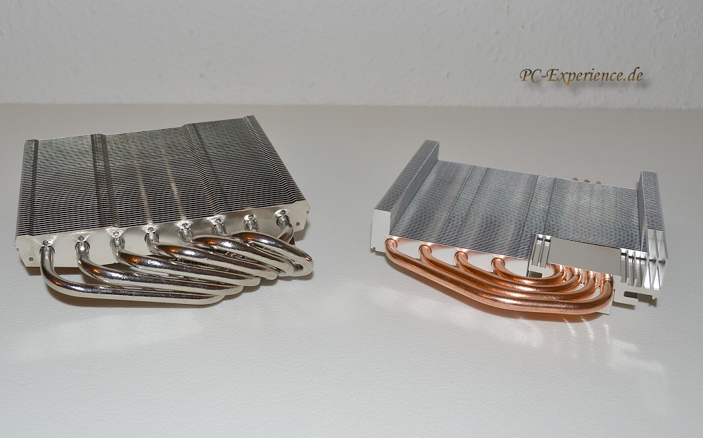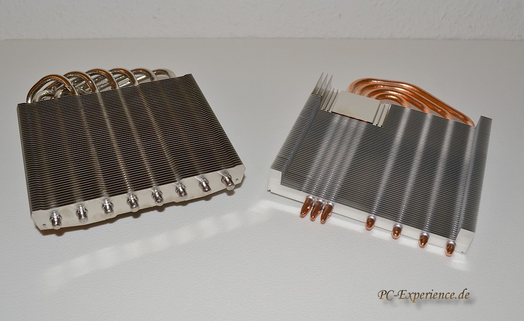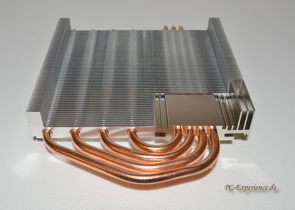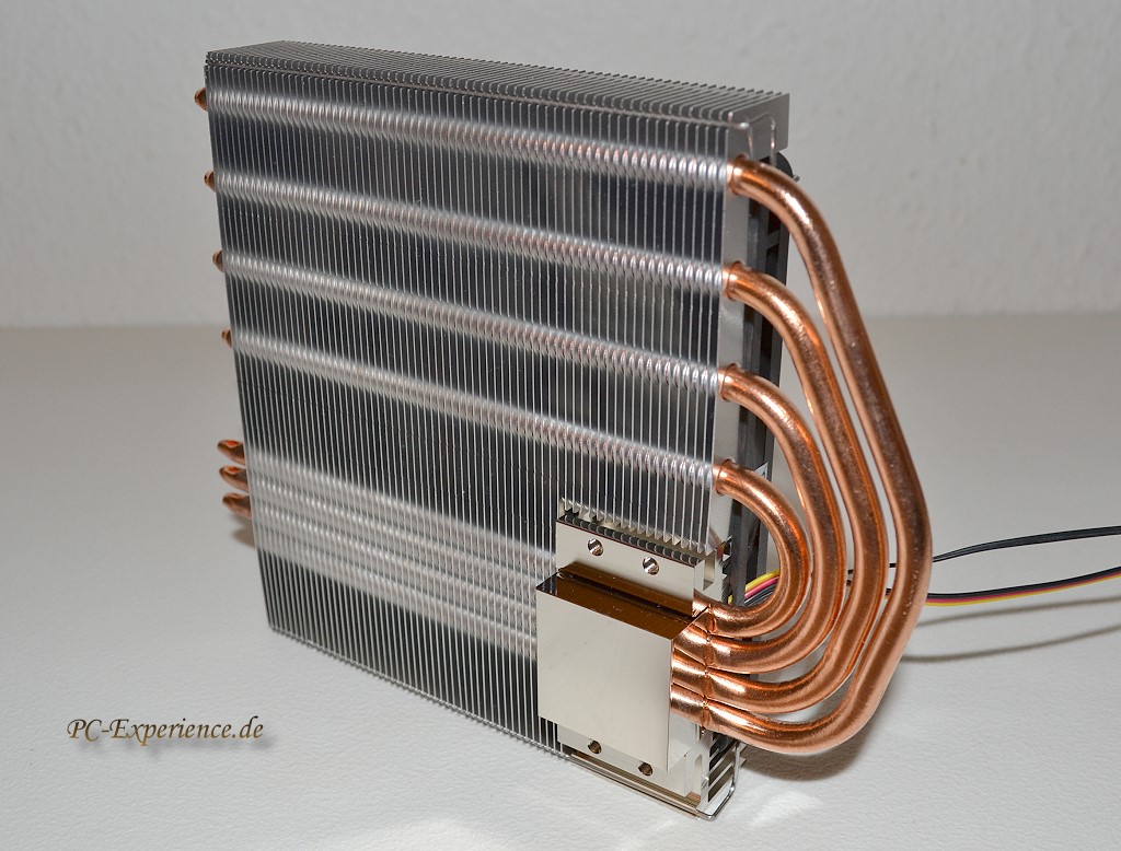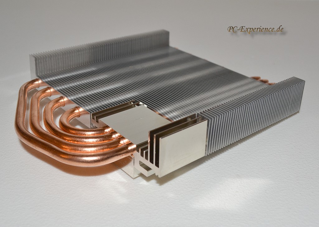 Die Verarbeitung attestieren wir als sehr hochwertig, wobei uns die gerade mal 0,3mm starken Lamellen etwas sehr dünn erscheinen. In der Praxis ließen sie sich für unseren Geschmack zu leicht verbiegen. Das ändert aber nichts an der gekonnten Integration der 68 Lamellen in das Gesamtkonstrukt. Das die Heatpipespitzen mehr oder minder unbehandeltes Kupfer offenbaren ist sicherlich kein Augenschmaus, aber angesichts des Preises logisch, für das Geld ist eine komplette Hochglanzvernickelung kaum möglich.