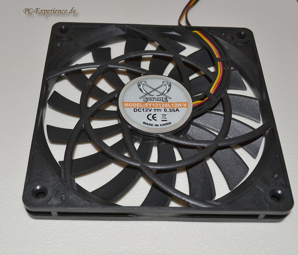 Der besonders flache Scythe Slipstream Lüfter (120x120x12mm) ist durchaus kein Unbekannter, er durchlief in einer anderen Variante auch schon Tests bei uns und konnte sich durchaus positiv in Szene setzen. Bezüglich des Fördervolumens dürfen naturgemäß keine Wunder erwartet werden, dafür ist der Lüfter einfach zu flach. Ein paar technische Aspekte dieses Lüfters abseits der Werksangaben sind trotzdem erwähnenswert. So läuft der Sliptream Slim bereits mit 4,86 Volt an und besitzt ein nahezu störgeräusch-freies Gleitlager.