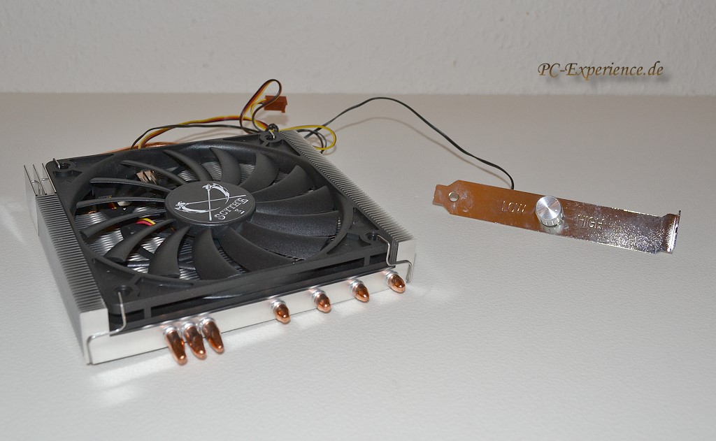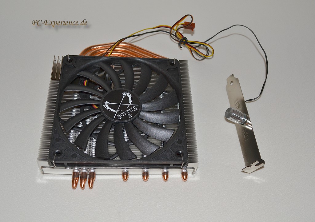 Wer den Lüfter gegen ein 120120x25 Exemplar tauschen möchte, der kann dies zumindest theoretisch tun, denn diese Lüfter passen durchaus in die Lamellen-Aussparungen des Setsugen 2. Was dann allerdings fehlt, sind geeignete Lüfterklemmbügel, die Werksbügel müßten dafür nicht unerheblich verbogen werden und das ist nun wirklich keine koschere Lösung. Eventuell liefert Scythe zu einem späteren Zeitpunkt noch andere Klemmen nach, oder empfiehlt passende Klemmen von anderen Kühlern aus ihrem Sortiment.