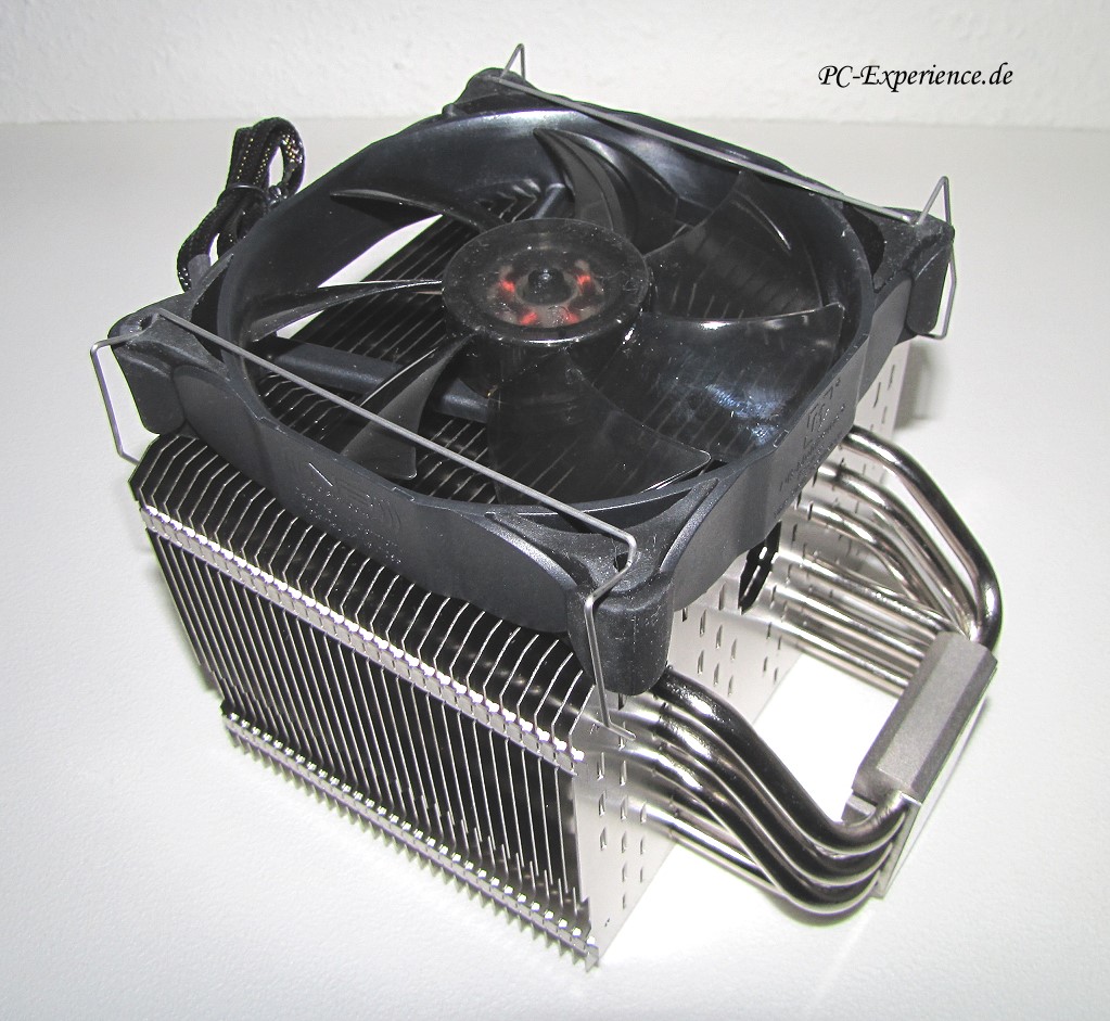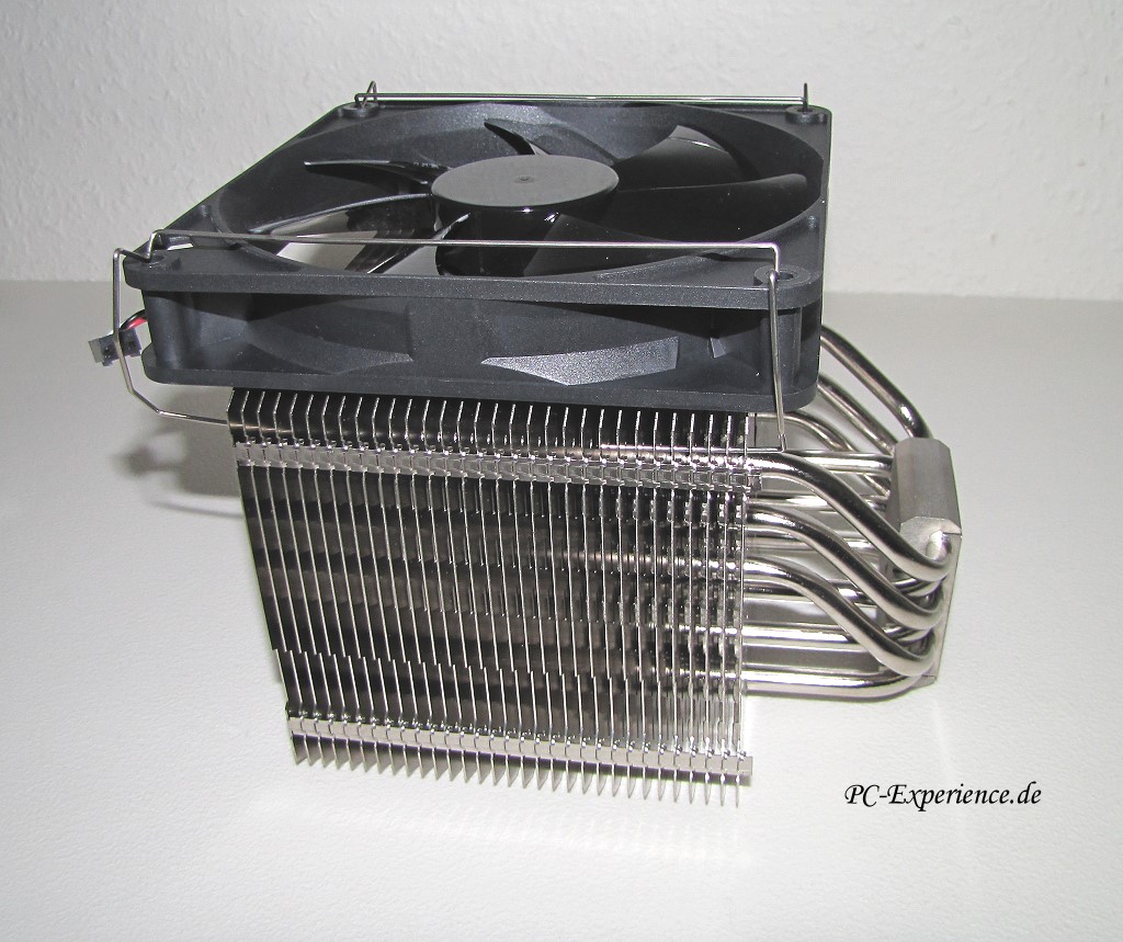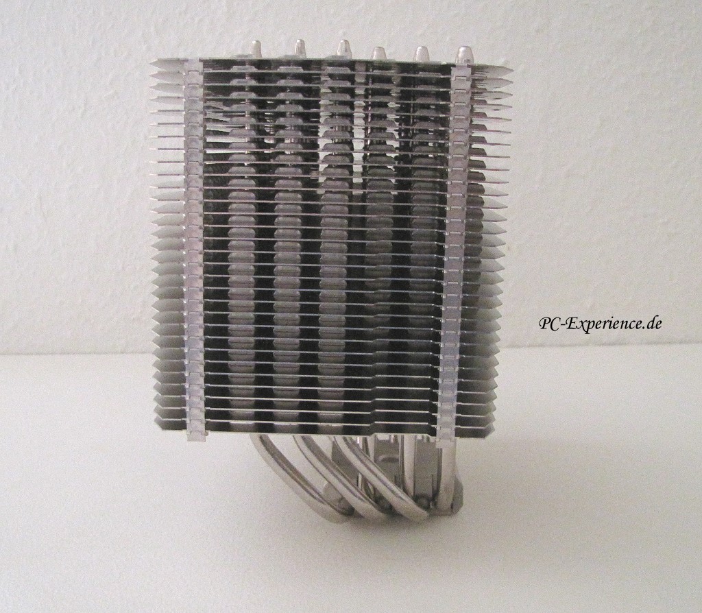 Das Heatpipe-Design ist etwas gewöhnungsbedürftig, erfüllt aber einen bestimmten Zweck. Durch die schrägen Heatipes rutscht ein Teil des Lamellenkörpers näher an den Heck- oder Deckellüfter und kann so indirekt effektiver belüftet werden. Durch den relativ großen Lamellenabstand von 3mm suggeriert der Kühler seine Affinität bezüglich einer passiven respektive semi-passiven Kühlung. Ob er dies tatsächlich besser bewerkstelligt, als der Ninja 3, werden wir uns im Testkapitel genauer anschauen.