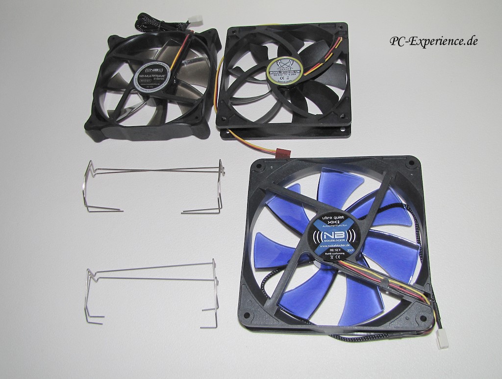 Als Lüfter können dank der weit öffnenden Haken im Grunde alle aktuell erhältlichen klassischen 120 und 140mm Lüfter verwendet werden. Auch solche, die an den Bohrlöchern Versteifungsstreben besitzen. Der beliebte Noiseblocker Multiframe Lüfter kann ebenfalls eingesetzt werden, wie wir noch sehen werden.