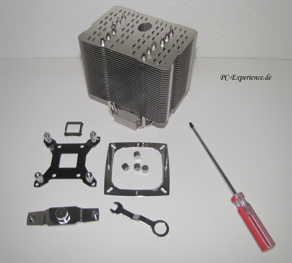 Zuerst sollte an der Backplate die richtige Position für die durchgehenden Bolzen eingestellt werden, also entweder für den Sockel 1366, 1156 oder 775. Diese Bolzen erhalten auch noch dünne Unterlegscheiben. Dann steckt man das Konsortium durch die entsprechenden Bohrungen im Mainboard und befestigt auf den Bolzen die passenden Gegenmuttern. Auf die wird der symmetrische Halterahmen gesetzt und fixiert. Nun kann der Kühler aufgesetzt und über den breiten Befestigungssteg festgezogen werden. Aber Vorsicht, die hintere der beiden Überwurfmuttern mit Federn erreichen wir jetzt nicht mehr, hier kommt der mitgelieferte Schraubendreher zum Einsatz. Sollte der Anpreßdruck nicht ausreichen, kann er über die zentrale große Stellschraube in der Mitte korrigiert werden. Auch hier gilt: Vorsicht ist die Mutter aller Porzellankisten.