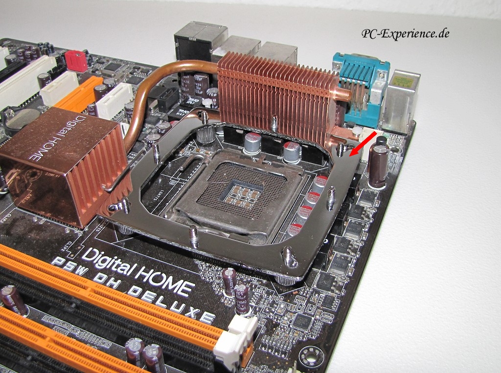 Über die Pushpin Kühlerbefestigung von Intel ist schon viel geschrieben worden, wir empfinden sie auch als mittelschwere Frechheit, zumal allein das Einrastgeräusch keinen Aufschluß darüber gibt, ob der einzelne Pin nun wirklich richtig eingerastet ist oder nicht. Von der Verschleißträchtigkeit dieser Kühlerbefestigung wollen wir dabei noch gar nicht reden. Den Kühler bei nicht ausgebautem Mainboard einzubauen halten wir für risikoreich, zumal nur auf der Rückseite zu erkennen ist, ob die Spreizstifte wirklich weit genug eingesteckt wurden: