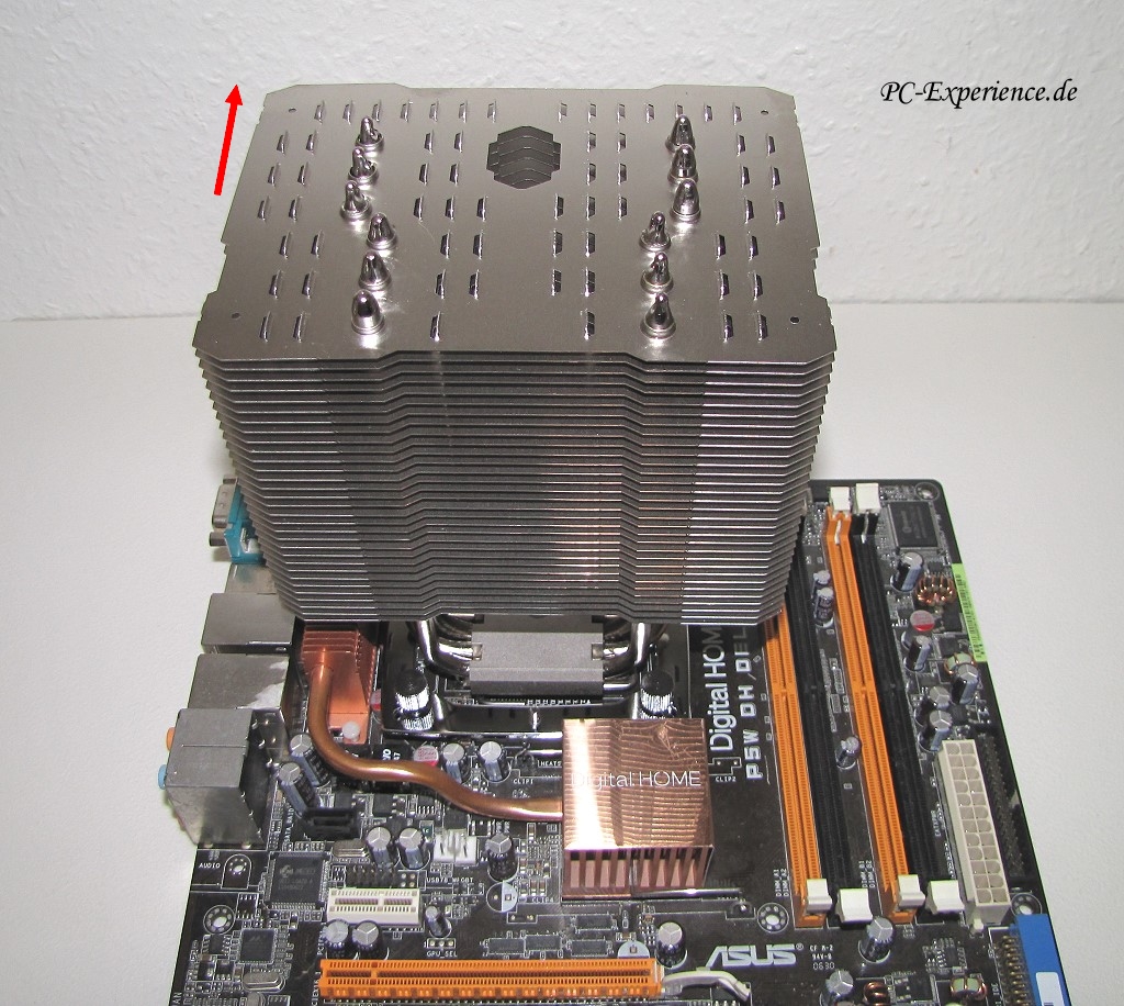 Die Güte der Befestigung ist als absolut hochwertig zu beurteilen, so daß unser Rechner durchaus auch eine Lan-Party überstehen sollte. Begünstigt durch das Mainboard-Layout kann man den Kühler wahlweise in Richtung Netzteil oder in Richtung Gehäuselüfter blasen lassen, wir haben uns für letzteres entschieden. Nicht zuletzt darum, weil so auch die aufsteigende Abwärme von Spannungswandlern & Co gleich mit in Richtung absaugendem Gehäuselüfter abtransportiert wird.