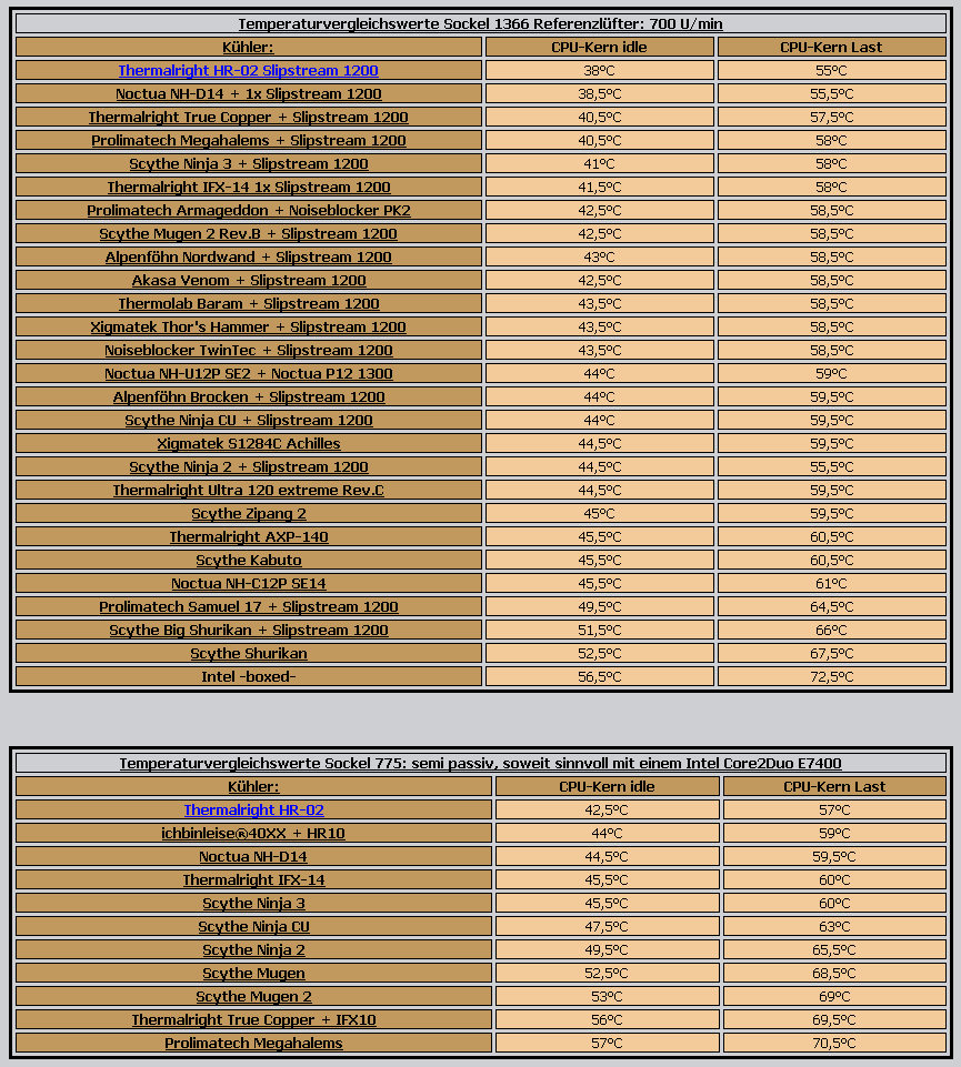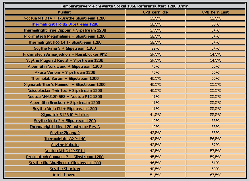 Um die wirkliche Kühlleistung der jeweiligen Kühler herauszukristallieren, haben wir für den Load-Test den Referenz-Lüfter auf 1200 U/min und für den Low Noise Test die Referenzlüfter auf 700 U/min einreguliert, denn bei gleichen Drehzahlen und Volumen entscheidet der Kühler über den Ausgang des Vergleichs. Verglichen haben wir den HR-02 Kühler mit allen bisher getesteten Sockel 1366 Kühlern: