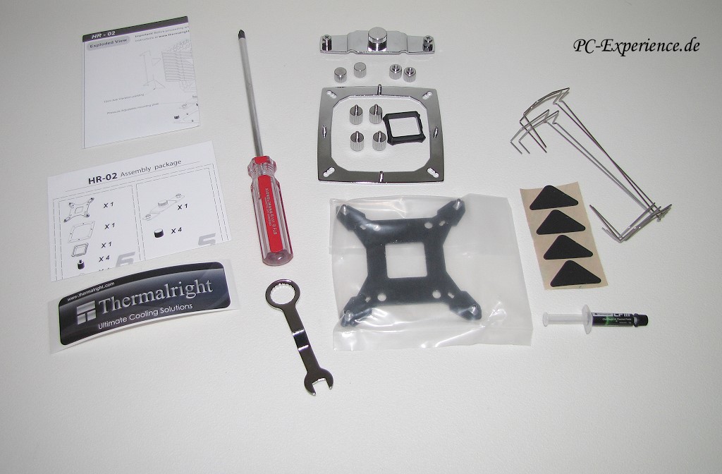 Natürlich ist es gut, das Thermalright seine Komponenten gut und sicher verpackt, allein die Optik der Pappschachtel ist ein Graus, allerdings immer noch komfortabler, als eine nicht mehr zu verschließende Blisterverpackung, die nur mit TNT zu öffnen war. Wie üblich hat Thermalright an die wesentlichen Zugaben gedacht: Intel Montagematerial, Wärmeleitpaste, Lüfterhaken (für 120 und 140mm Lüfter) und sogar Werkzeug. Ob wir es wohl noch erleben werden, das Thermalright eine deutsch übersetzte Anleitung beilegt?