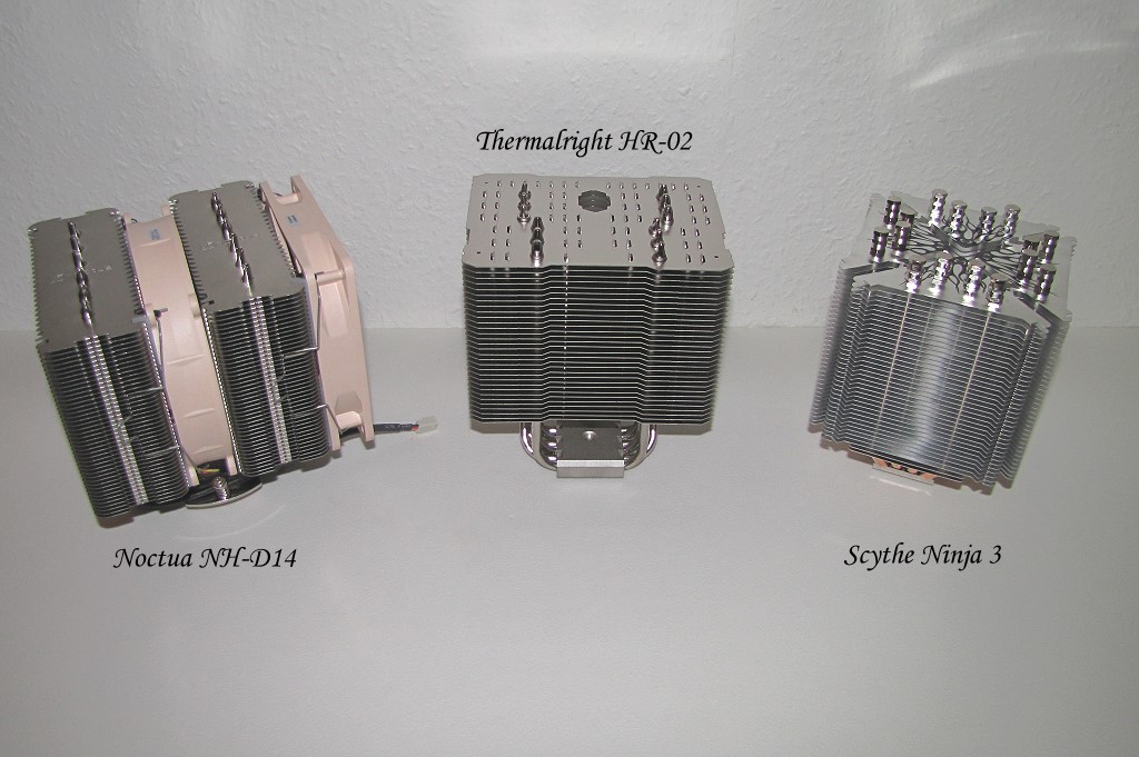 Im Vergleich zum HR-01 und HR-01 Plus hat der neue HR-02 deutlich an Kühlvolumen zugelegt und sieht ganz und gar nicht mickerig aus, wenn man den Noctua NH-D14 oder den Scythe Ninja 3 daneben stellt. Die schiere Größe von 160mm x 140mm x 110mm zeigen eines auch ganz deutlich auf: ein PC Gehäuse ab 190mm Breite aufwärts sollte schon vorhanden sein, sonst kann es sehr eng werden, wenn das Gehäuseseitenteil wieder geschlossen wird.