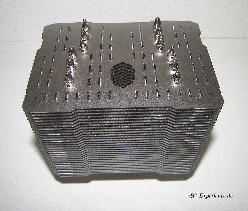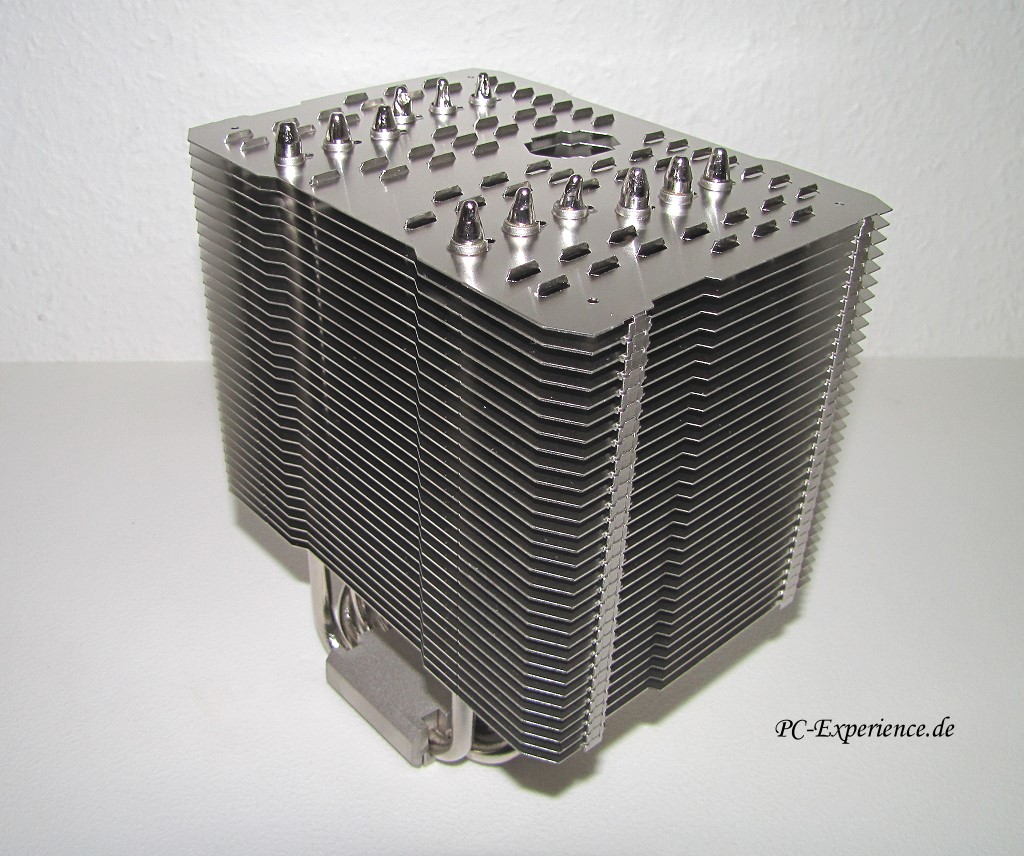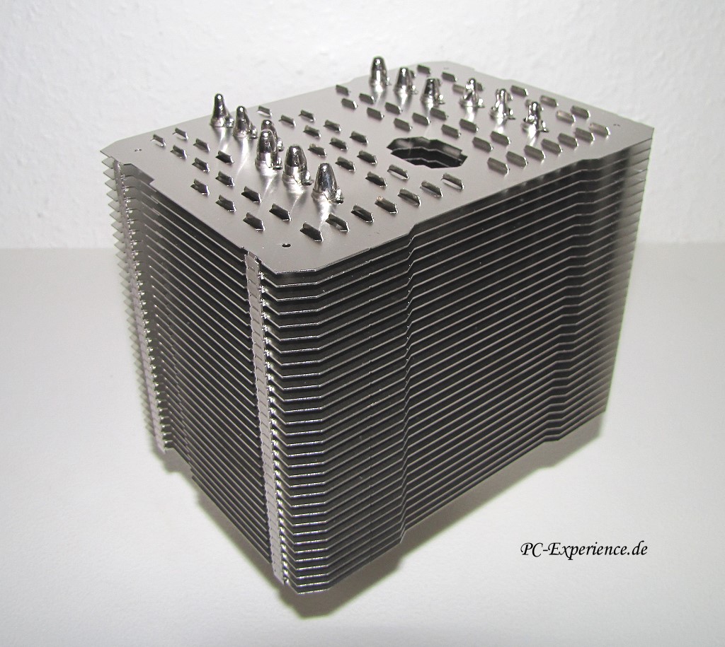 Die gesamte Kühlfläche erreicht mit fast 4400cm² durchaus schon Spitzenwerte (Noctua NH-D14: 6100cm², Prolimatech Megahalems: 4200cm², Thermalright Venomus X: 3800cm², Scythe Ninja 3: 4400cm²), um nur vier aktuelle Beispiele zu bemühen. Die Heatpipe-Positionierung wurde in der symmetrischen Grundstruktur des Kühlers immer weiter optimiert, so daß die Ventilation durch den Lüfter möglichst viele Heatpipes auch tatsächlich erreicht. Kleine Belüftungsschächte innerhalb der Lamellen tragen ebenfalls einiges dazu bei.
