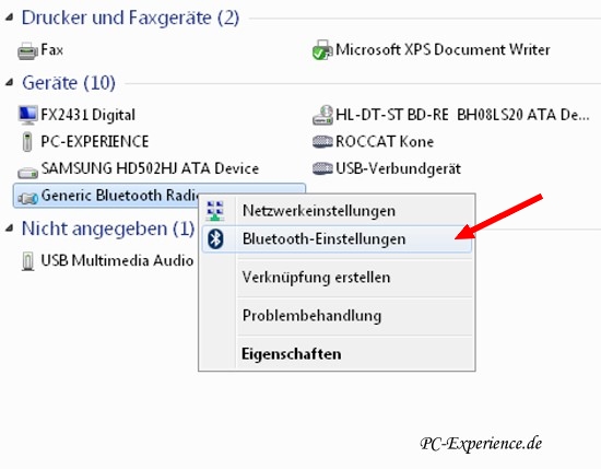 Dazu begeben wir uns in die Systemsteuerung und rufen dort die Rubrik Geräte und Drucker auf. Für uns ist jetzt das Symbol, das zu unserem Bluetooth Gerät gehört, wichtig. Dieses klicken wir mit der rechten Maustaste an und wählen aus dem Kontextmenü die Option Bluetooth-Einstellungen aus, denn genau dort wollen wir hin: