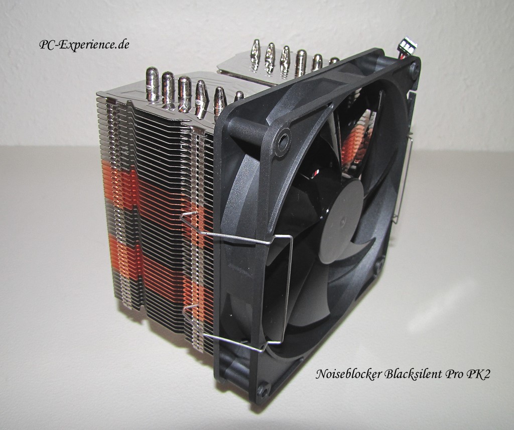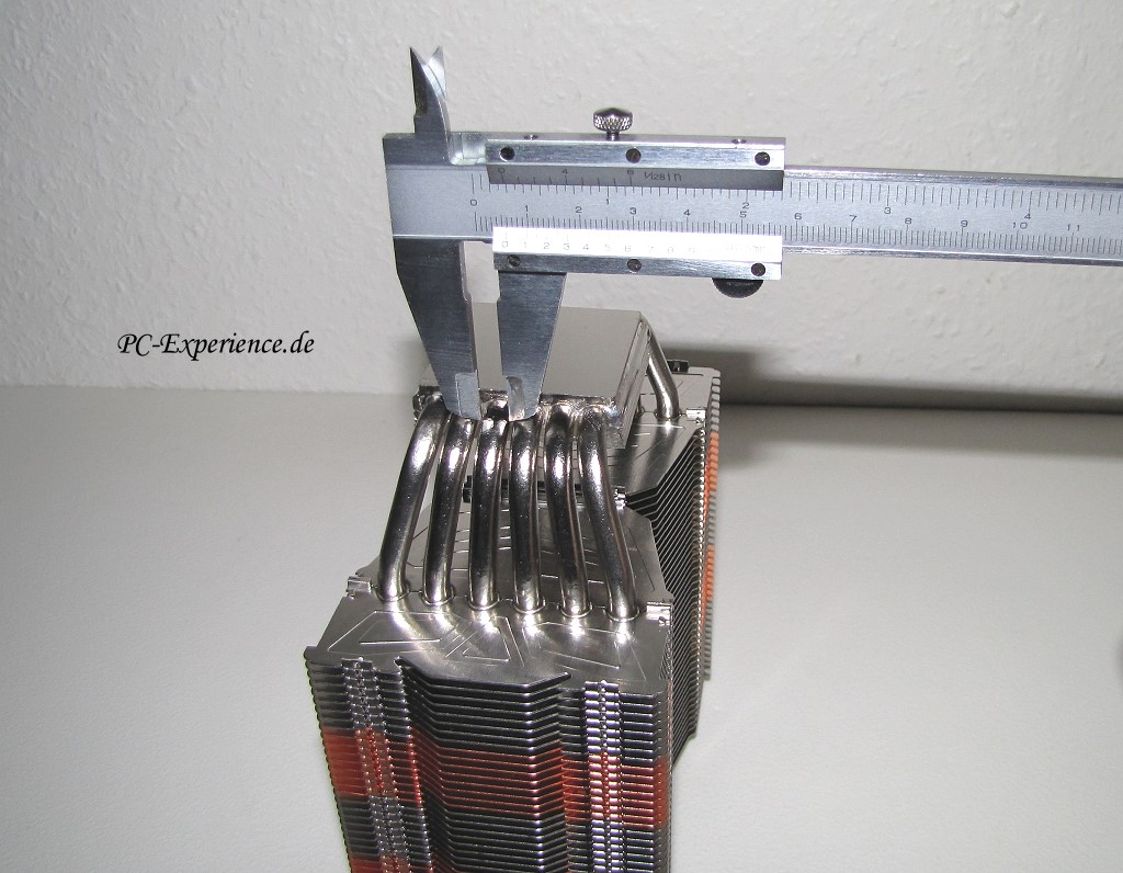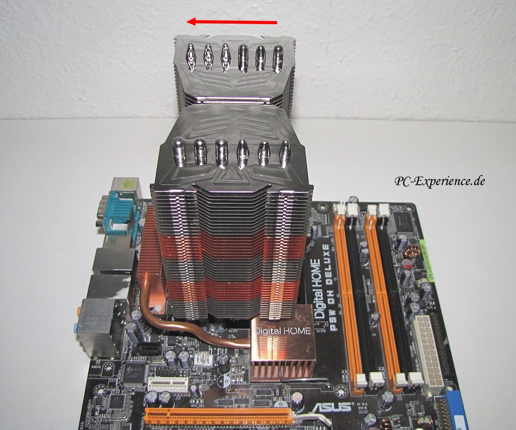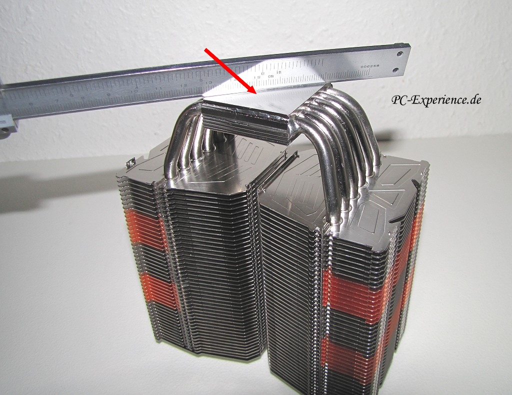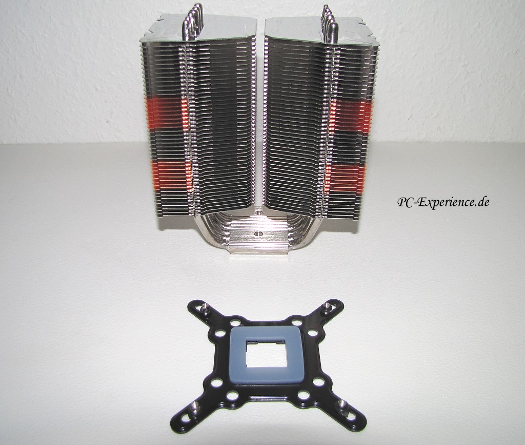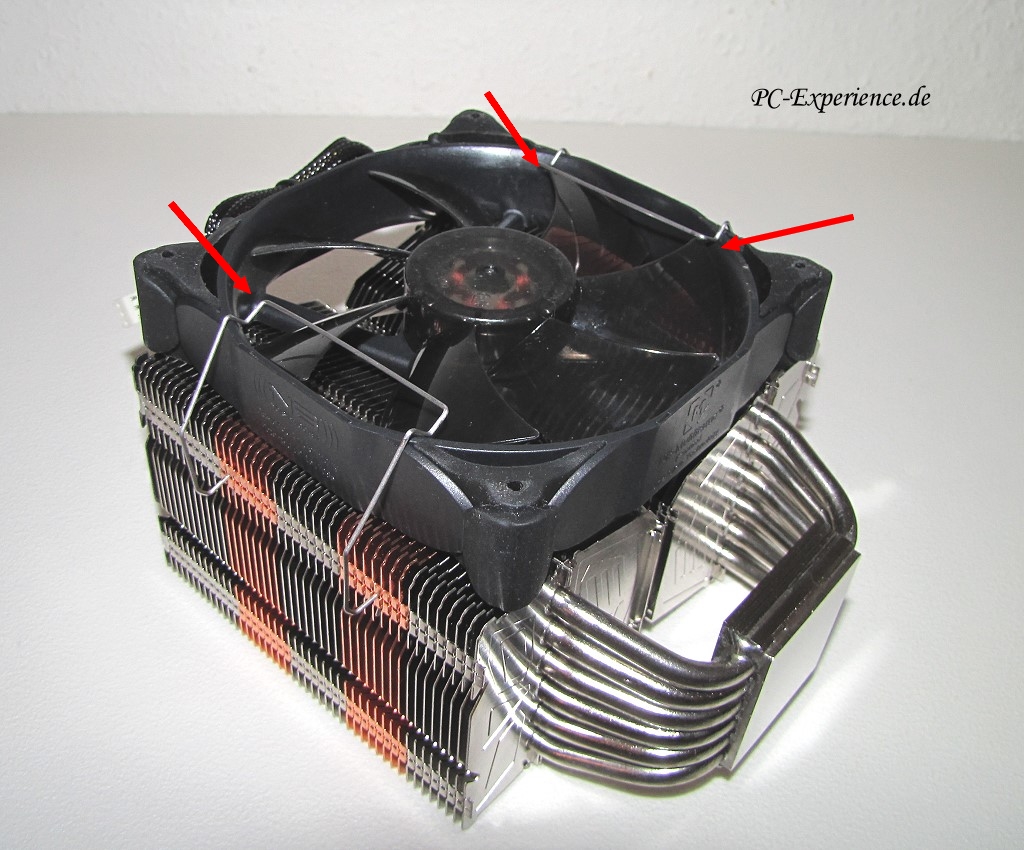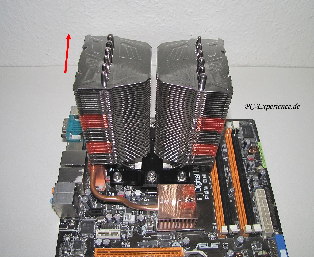 Eine horizontale respektive vertikale Ausrichtungs-Direktive entfällt bei der U-Form der Heatpipes, darum spielt es auch keine Rolle, wie der Kühler auf dem Mainboard ausgerichtet und verbaut wird. Bei der Ausrichtung des Lüfters wäre zu beachten, das er möglichst mittig an den Lamellen sitzt und nicht etwa oben oder runten an den Kühlerlamellen zu viel vorbeibläst. Bei der Wahl des Lüfters sollte man sich darüber im Klaren sein, das ein 140mm Lüfter zwar problemlos zu befestigen wäre, aber auch einen nicht unerheblichen Teil seiner Luft am Kühler vorbeibläst, wie unser letztes Bild deutlich zeigt. Das muß nicht zwangsläufig in höheren Temperaturen resultieren und hat den Vorteil, das umliegende Bauteile recht gut mit Luft ventiliert werden.