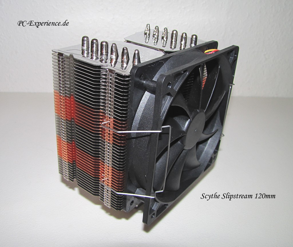 Nun stellt sich natürlich die Frage nach dem idealen Lüfter für diesen Kühler. Wir präferieren einen 120mm Lüfter, in diesem Fall unseren bewährten Scythe Slipstream. Der Scythe Slipstream 1200 Lüfter fristet nicht ohne Grund schon einige Zeit sein Dasein in unserer Referenzliste, da er immer dann zum Einsatz kommt, wenn enge Lamellen entsprechenden Druck benötigen und unsere Ohren trotzdem keinen Schaden nehmen. Der Scythe Slipstream konnte sich in allen Belangen gekonnt in Szene setzen. Bei 12Volt (7 Volt) und realen 1216 U/min (803 U/min) "belastet" der Lüfter das menschliche Ohr mit 25,5 dBA (18,5 dBA). Bei 5 Volt Ansteuerung rotiert der Lüfter noch mit 536 U/min und erzeugt 14 dBA. Dazu gesellen sich nahezu nebengeräuschfreie Lager und eine Scalierung von 4,6 bis 13,8 Volt.