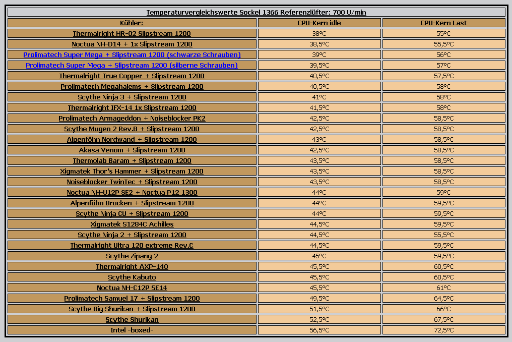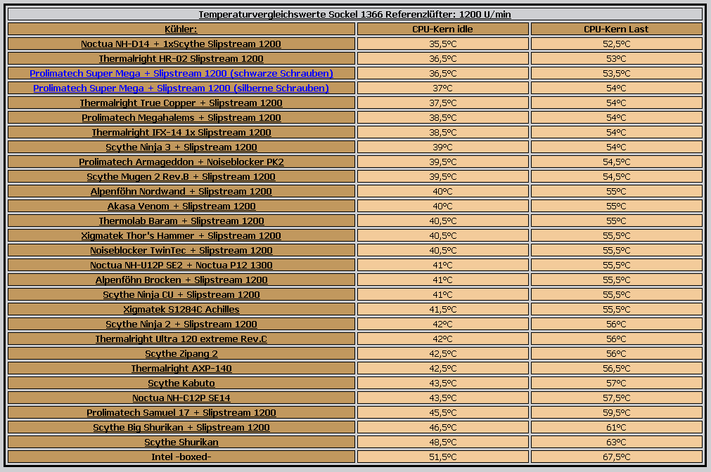 Um die wirkliche Kühlleistung der jeweiligen Kühler herauszukristallieren, haben wir für den Load-Test die Referenz-Lüfter auf 1200 U/min und für den Low Noise Test die Refrenzlüfter auf 700 U/min einreguliert, denn bei gleichen Drehzahlen und Volumen entscheidet der Kühler über den Ausgang des Vergleichs. Verglichen haben wir den Super Mega Kühler mit allen bisher getesteten Sockel 1366 Kühlern: