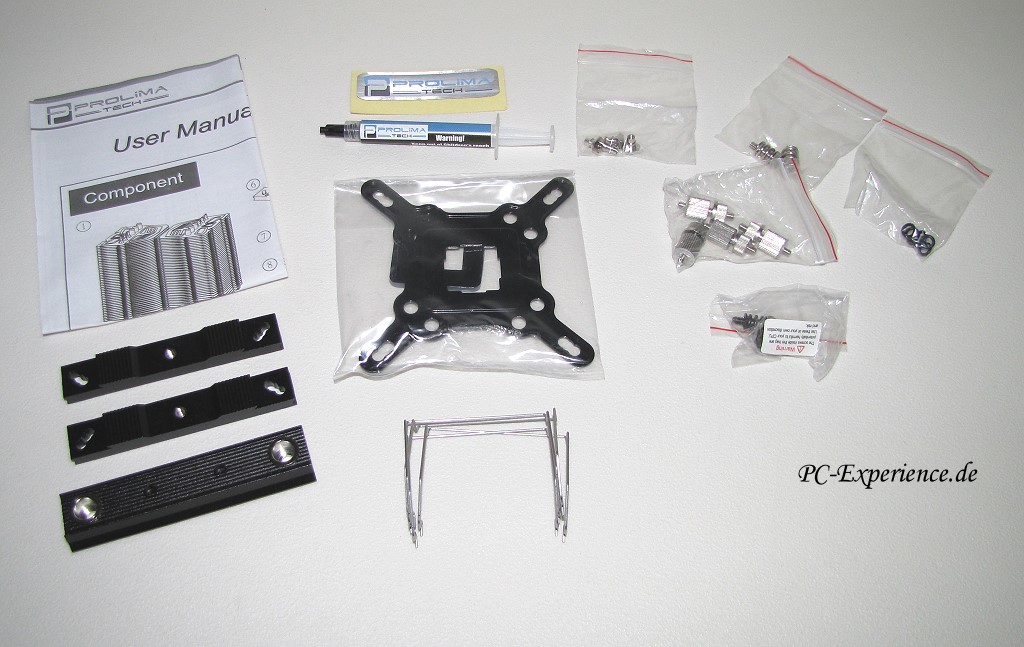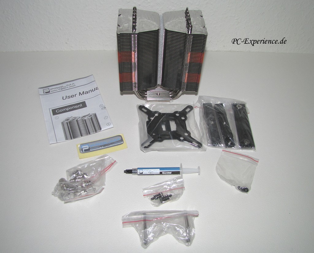Die schiere Größe von 158,7mm x 130mm x 74mm (Höhe x Breite x Tiefe, ohne Lüfter) zeigt eines auch ganz deutlich auf: ein PC Gehäuse ab 190mm Breite aufwärts sollte schon vorhanden sein, sonst kann es sehr eng werden, wenn das Gehäuseseitenteil wieder geschlossen wird. Ansonsten liefert Prolimatech alles wichtige für die Montage in der Farbenfrohen Verpackung: Befestigungsmaterial für die Sockel: 775, 1156, 1366 ->4 Klammern für Lüfterbefestigung ->Wärmeleitpaste Prolimatech PK-1 und eine bebilderte Anleitung. AMD Besitzer gehen mal wieder leer aus, das optionale Einbaukit muß zusätzlich gekauft werden, ein Umstand, den wir nicht nachvollziehen können.