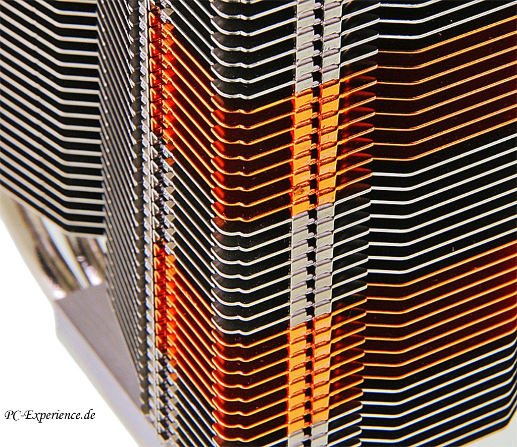 Für einen reinrassigen Passivbetrieb stehen wie bereits erwähnt die Lamellen (2mm Abstand) zu eng zusammen, auch wenn der Passivtest auf unserem System mit dem relativ genügsamen Intel Core 2 Duo E7400 gar nicht so schlecht ausfällt. Dazu sollte man berücksichtigen: die Verringerung des Lamellenabstandes bewirkt zwar grundsätzlich eine größere Kühlfläche, wirkt sich aber auf einen eventuellen Passivbetrieb des Kühlers kontraproduktiv aus, da so die Abwärme des Lamellennachbars thermische Auswirkungen erzeugt. Darüber hinaus erhöht sich durch den engen Lamellenabstand natürlich der Strömungswiderstand. Um das zu kompensieren, bedarf es eben eines Lüfters mit entsprechendem Druck sprich Fördervolumen.