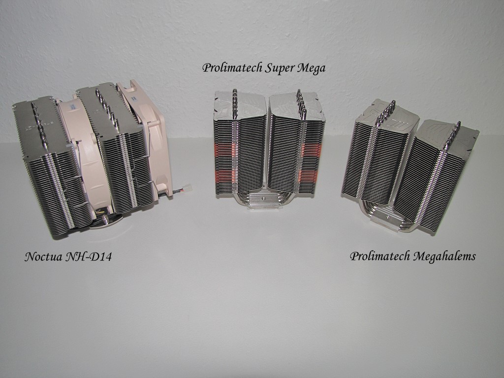 Das ändert natürlich nichts daran, das diese riesigen Tower-Kühler dank ihrer Abmessungen nicht unbedingt das Kompatibilitäts-Einmaleins erfunden haben, wie man im Größenvergleich sicherlich unschwer erkennen kann. Das Doppeltower-Layout des Super Mega Kühlers verfolgt eine etwas andere Strategie als Thermalright mit seinem IFX-14 oder Noctua mit dem ND-D14. Die Tower sind nicht hintereinander, sondern parallel mit einem nicht unbeträchtlichen Spalt zwischen den Towern geschaltet. Da die Lamellen der beiden Tower aber zum Spalt hin verschlossen sind, erbringt der Spalt keine Vorteile am Abtransport der Abwärme. Die Anordnung der Heatpipes unterscheidet sich deutlich vom Prolimatech Armageddon. Dort wurden die Heatpipes so versetzt angeordnet, dass sie möglichst alle vom Luftstrom des Lüfters profitieren, dies ist beim Super Mega definitiv nicht der Fall.