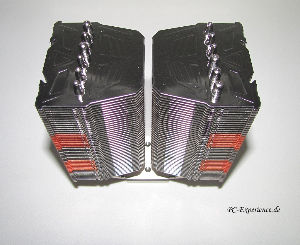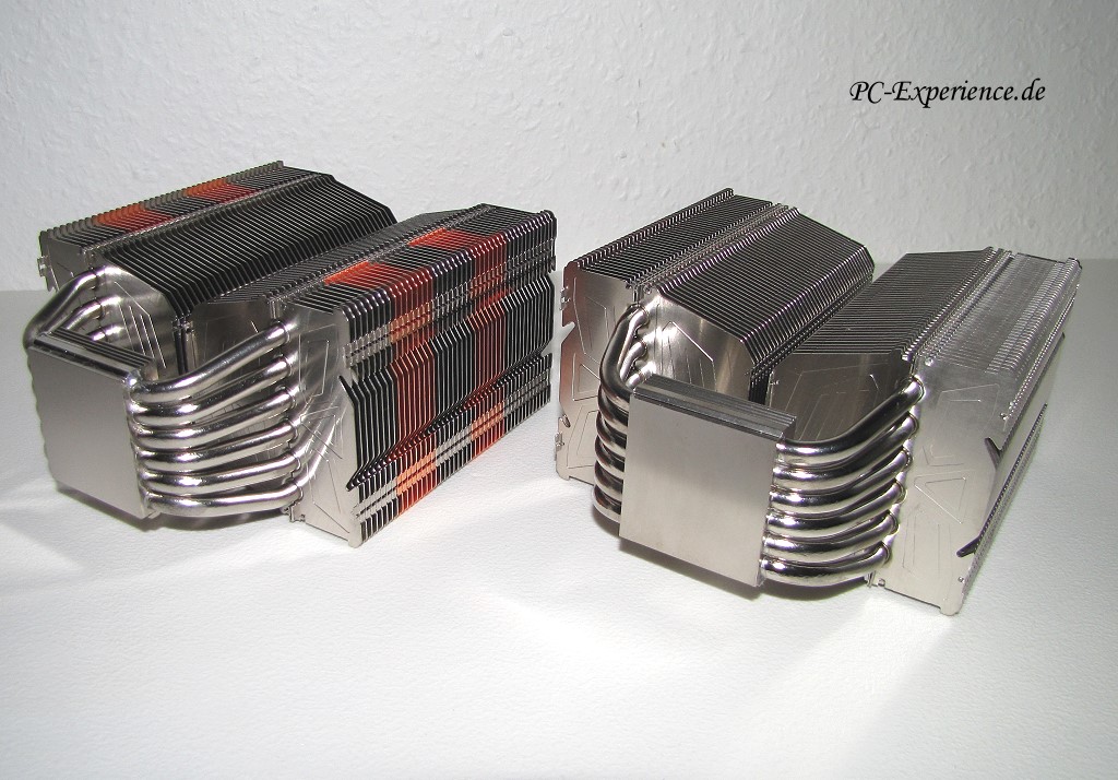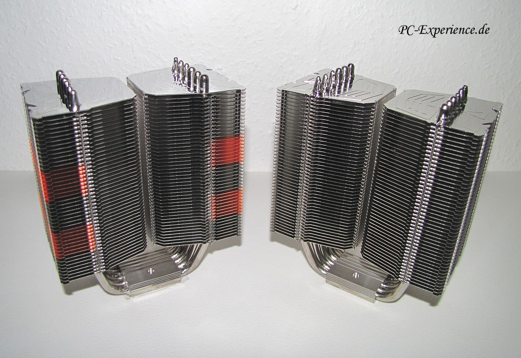 Die Bilder signalisieren es schon, die Abmessungen sind im Vergleich zum Megahalems identisch. Dies trifft auch auf die Kühlfläche der abermals vorhandenen 45 Lamellen zu: ca. 3900cm². Bei der Konkurrenz schaut es folgendermaßen aus: Noctua NH-D14: 6100cm², Thermalright Venomus X: 3800cm², Scythe Ninja 3: 4400cm², um nur drei prominente Beispiele zu bemühen. Ebenso deutlich wird aber auch, das die Außenbezirke von 16 Lamellen aus Kupfer gefertigt wurden, was dem Gesamtgewicht dann gleich 200 zusätzliche Gramm beschert. Eines hat sich nicht geändert, die ausgezeichnete Verarbeitung, die sich problemlos mit den Besten in der Branche messen kann.