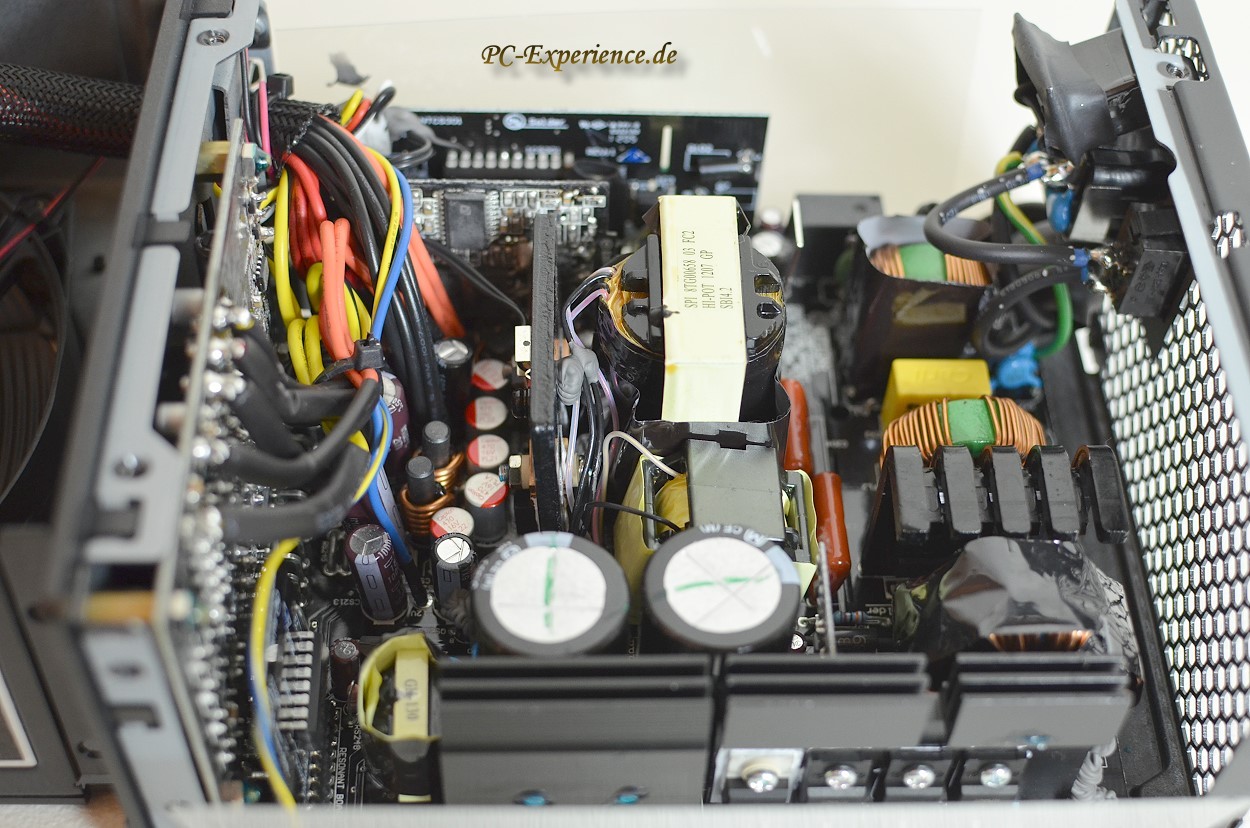 Spulen, X-und Y Kondensatoren und Metal Oxide Varistoren entstammen ansonsten dem gängigen gehobenen Sortiment aus Japan, das für diese Preisklasse üblich ist. Schrumpfschläuche und Isolierungen sind dort, wo sie benötigt werden, vorhanden. Spulenstrümpfe, wie wir sie nennen, entdeckten wir diesmal keine, Siliconverwendung zur Stabilisierung vorhandener Wackelkandidaten hält sich in erträglichen Grenzen, be quiet scheint sich seiner Sache bezüglich Störgeräusche in Form von Pfeifen oder Fiepen sehr sicher zu sein.