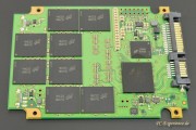 Auf jeder Seite der Platine finden wir acht Stück MLC Flash Bausteine von Micron, die in einer Struktur von 16nm gefertigt wurden und über die aktuelle ONFI 3.0 Schnittstelle eingebunden werden. Diese Fertigungskomprimierung dürfte und sollte sich positiv auf die Produktionskosten auswirken, warum die kleine 128 GB MX100 davon ausgespart wurde, bleibt uns vorerst ein Rätsel, eine Nachfrage bei Crucial steht diesbezüglich noch aus. Die Dichte der Flashbausteine beträgt bei unserem MX100 256 GB Testlaufwerk 128Gbit, beim MX100 Laufwerk mit 512 GB Laufwerk 256 Gbit. Inwieweit die 16nm Fertigung negative Auswirkungen auf die Dauerhaltbarkeit haben wird, müssen wir aber abwarten, dazu kann dieser Test natürlich keine valide Aussage reflektieren. Wie schon bei der M550 entschloß sich Crucial auch für die MX100 wieder zur Reduzierung der Spare Area und reduzierte das Over-Provisioning wieder auf ca. 7%. Die Begründung dafür liefert die verbesserte Produktionsreife der verwendeten Speicherchips und die optimierten Fehlerkorrekturen einschließlich überarbeiterter Datenintegritäts-Maßnahmen.